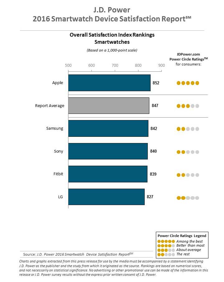 Společnost J.D. Power, která se specializuje na spotřebitelské testy zveřejnila výsledky svého testu spokojenosti se smartwatch pro rok 2016 a Apple je jednoznačným vítězem. Dotazník se týká 2696 uživatelů SmartWatch, kteří si své hodinky zakoupili v uplynulých dvanácti měsících. Dotazy se týkali snadnosti použití, komfortu, životnosti baterie, funkcí, ceny, kvality, velikosti displeje, vzhledu, spolehlivosti, počtu aplikací a zákaznického servisu.