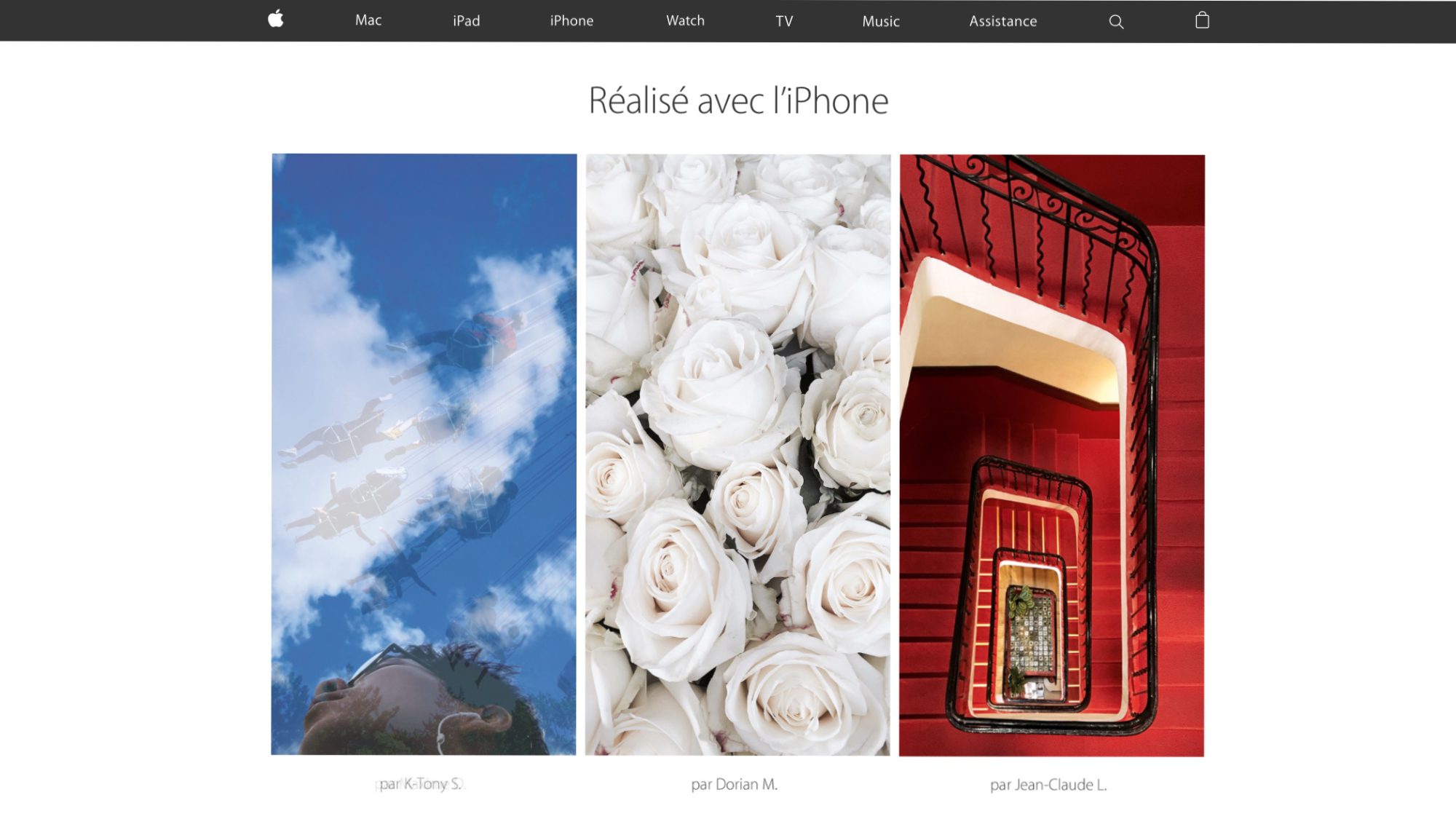 Domovskou stránku francouzského odnože Apple si můžete prohlédnout zde. 3 svislé obdélníky, kdy každý specifikuje jednu barvu francouzské trikolory, zobrazují různé fotografie, které se zároveň postupně mění. Všechny fotografie jsou pak pořízeny z iPhonů jednotlivých uživatelů, kteří je dali k dispozici do této Apple kampaně.