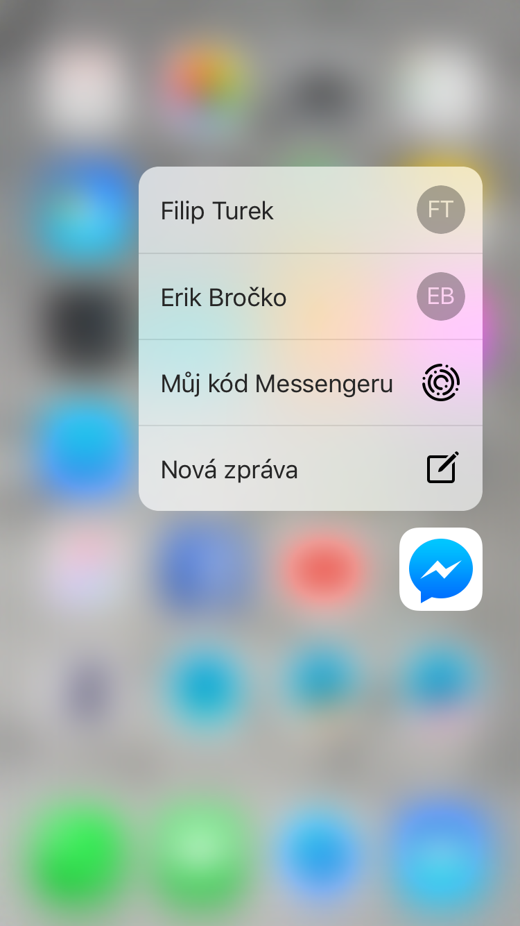 Facebook aktualizoval svůj Facebook Messenger pro iOS a přinesl plnou podporu iPhone 6s včetně 3D touch. Nově tak můžete na ikonku aplikace zatlačit a rovnou pokračovat v právě probíhajících konverzacích. 3D touch vám také umožňí ukázat náhled posílaných médií, nálepek, videí nebo odkazů bez toho, aniž byste museli otvírat aplikaci.