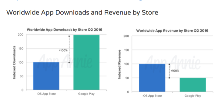 Podle výsledků za druhý kvartál je App Store o 100% více ziskovější než Play Store i přes to, že Play Store zaznamenává dvojnásobek celkového počtu stahování. Tento trend tedy navazuje na výsledky z prvního kvartálu s tím, že tentokrát jsou zase o podstatnou část lepší (75% v Q1, 100% v Q2).