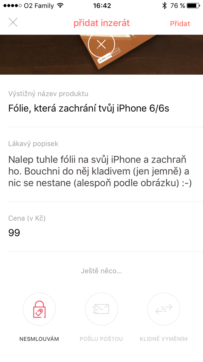 Pokud vás nějaký inzerát při brouzdání zaujme a rozkliknete jej, abyste se podívali na podrobnosti, opět zjistíte, že je vše skutečně jednoduché. V detailu inzerátu totiž najdete fotografii, název, podrobnější popis produktu, cenu, prodejce a nakonec i dodatečné informace, zda můžete (jako na správném trhu) usmlouvat cenu, zda je prodejce ochotný jej vyměnit za něco jiného nebo dokonce jestli vám jej pošle poštou. Z detailu inzerátu také můžete ihned prodejce kontaktovat a domluvit se s ním na podrobnostech týkajících se osobního převzetí, případně zjistit další informace o nabízeném produktu.