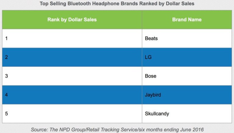 Nejprodávanějšími značkami v této kategorii pak jsou Beats, LG, Bose, Jaybird a Skullcandy. Beats a LG pak vlastní více než 65% trhu a v podstatě mu dominují. Značka Jaybird vděčí své pozici v TOP 5 především díky svým skvělým sportovním sluchátkům x2, které jsou v USA extrémně populární, především mezi aktivními lidmi. Pětici uzavírá společnost Skullcandy, která nabízí mnoho levnějších řešení zejména pro nenáročnou (z audio hlediska) klientelu. Je otázka, jak moc se tato statistika změní v druhé polovině letošního roku, až vyjde iPhone bez klasického 3,5mm konektoru.