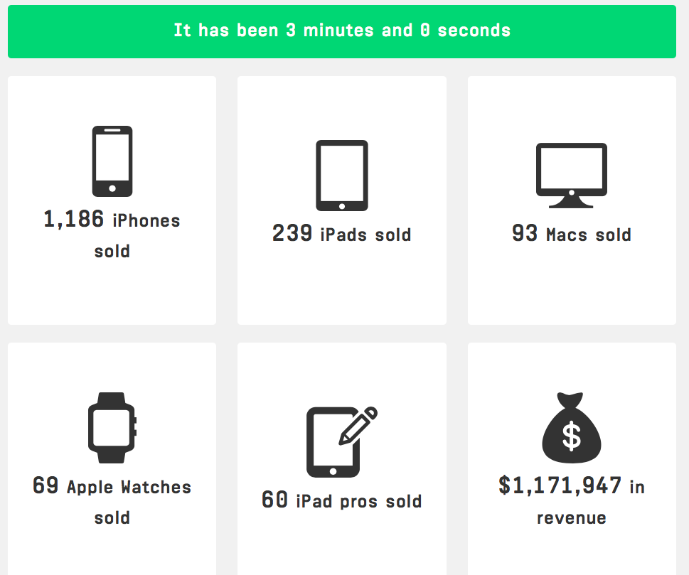 Na nové stránce od vývojáře Neala Agarwala se to dozvíme. Neal totiž vytvořil web everysecond.io, na které můžete vidět kolik iPhonů, iPadů, Maců, Apple Watch a iPadů Pro prodá kalifornská společnost každý sekundu. Dále můžete vidět, jak bleskurychle se stahují aplikace z App Store nebo jak rychle Apple vydělává. Najdete zde ale i rychle rostoucí částku, kterou uživatelé utrácí za aplikace v App Store nebo kolik Apple investuje do výzkumu, vývoje a marketingu.