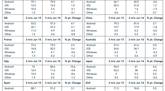 Naopak ve Velké Británii je model SE velice žádaným kusem a za druhý kvartál si připsal 9,2% prodejů a stal se tak nejlépe prodávaným smartphonem za toto období. Následuje iPhone 6s, který zaznamenal 9,1% prodejů. Na další konkrétní výsledky se můžete podívat v podrobné tabulce níže. Potvrzuje například propad v Applu v Číně kde prodeje iPhonu klesaly, stejně tak jako propad v Japonsku, který byl navíc poměrně drastický – o celých 4,2%. Uvidíme, jak s těmito čísly zamává nadcházející iPhone 7, který by se měl objevit na některých trzích už příští měsíc.