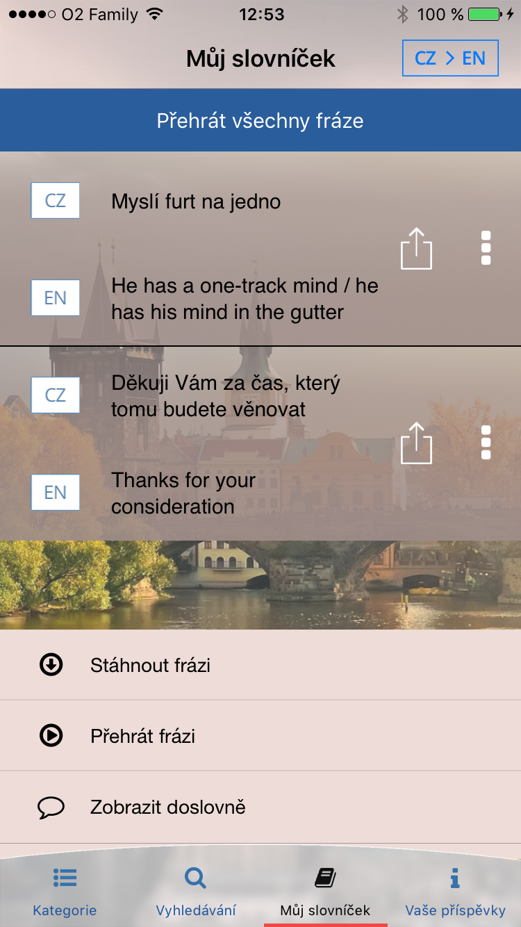 V LingoNative lze zobrazit fráze jak z češtiny do angličtiny, tak i obráceně. Všechny si navíc můžete i poslechnout, jelikož jsou namluvené rodilým mluvčím a zní tedy přesně tak, jako by je řekl Angličan nebo Čech. Fráze, které se vám zalíbily nebo víte, že je budete ještě potřebovat, si můžete uložit do slovníčku, kde je opět můžete přehrávat, zkopírovat a dokonce si stáhnout jejich audio verzi pro případ, že nebudete v zahraničí připojeni k internetu.