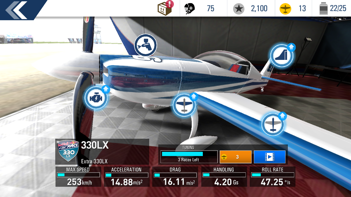Co rozhodně potěší fanoušky Red Bullu z ČR je fakt, že hrou vás provádí Martin Šonka, jediný český reprezentat v závodech Air Race. Ten vám hned na úvod vysvětlí, že jednotlivé závody vyžadují jednotlivé stroje, které si následně vylepšujete za peníze, které získáváte buď ze závodů nebo si je v rámci mikrotransakcí nakupujete za skutečné peníze. Hru jsem sice nedohrál, ale mám pocit, že pokud jste trpěliví a nebo hru hrajete tak jako já občas na toaletě, pak nemusíte utratit ani korunu.