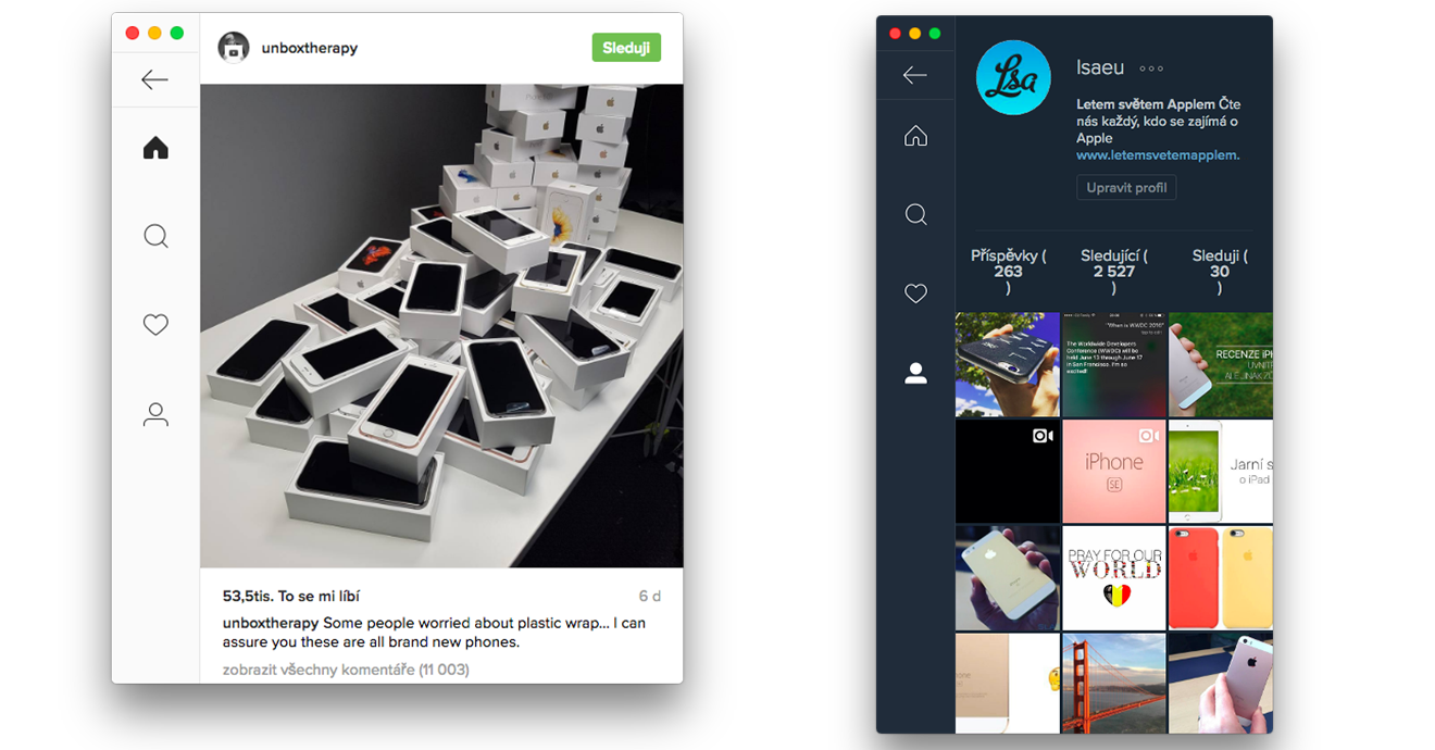 Ramme vám oproti oficiální webové stránce nabídne i klávesové zkratky a dovolí v rámci možností upravit si velikost okna podle svých potřeb, tudíž i tak, aby byla podoba s Instagramem na smartphonu co největší. Jediné, co se na desktopu trochu liší, je umístění funkčních tlačítek, která jsou v Ramme na levé straně, zatímco v oficiální aplikaci jsou vespod.