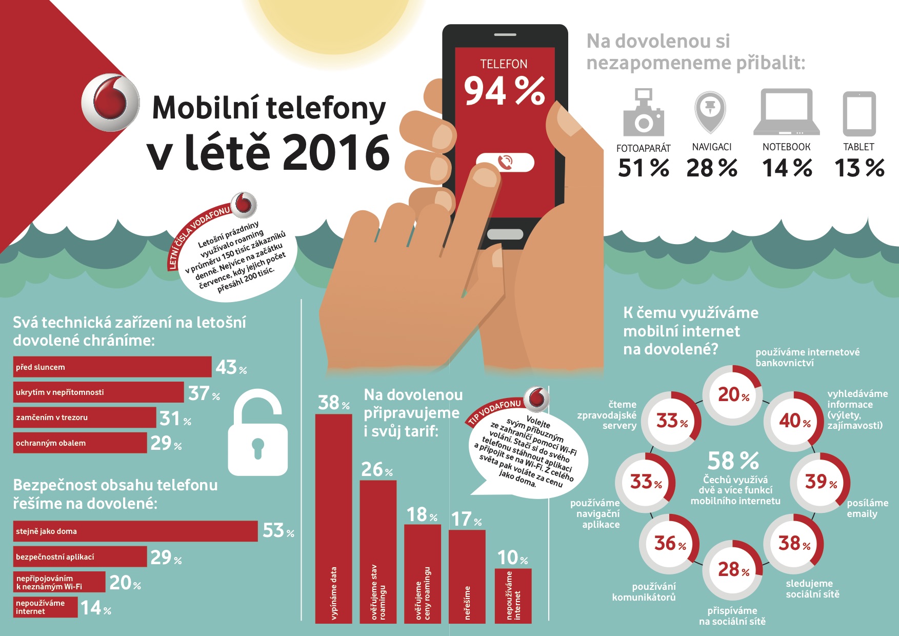 Tisková zpráva: Mobilní telefon si letos na dovolenou přibalil skoro každý Čech a rozhodně ho nevezl jen pro případ nouze. Polovina z českých turistů ho využívá jako náhražku fotoaparátu a velká část si neodpustí ani brouzdání na internetu. Vyplývá to z průzkumu, který pro Vodafone realizovala agentura STEM/MARK na 510 respondentech aktivních na internetu ve dnech 26. 7. – 2. 8. 2016.