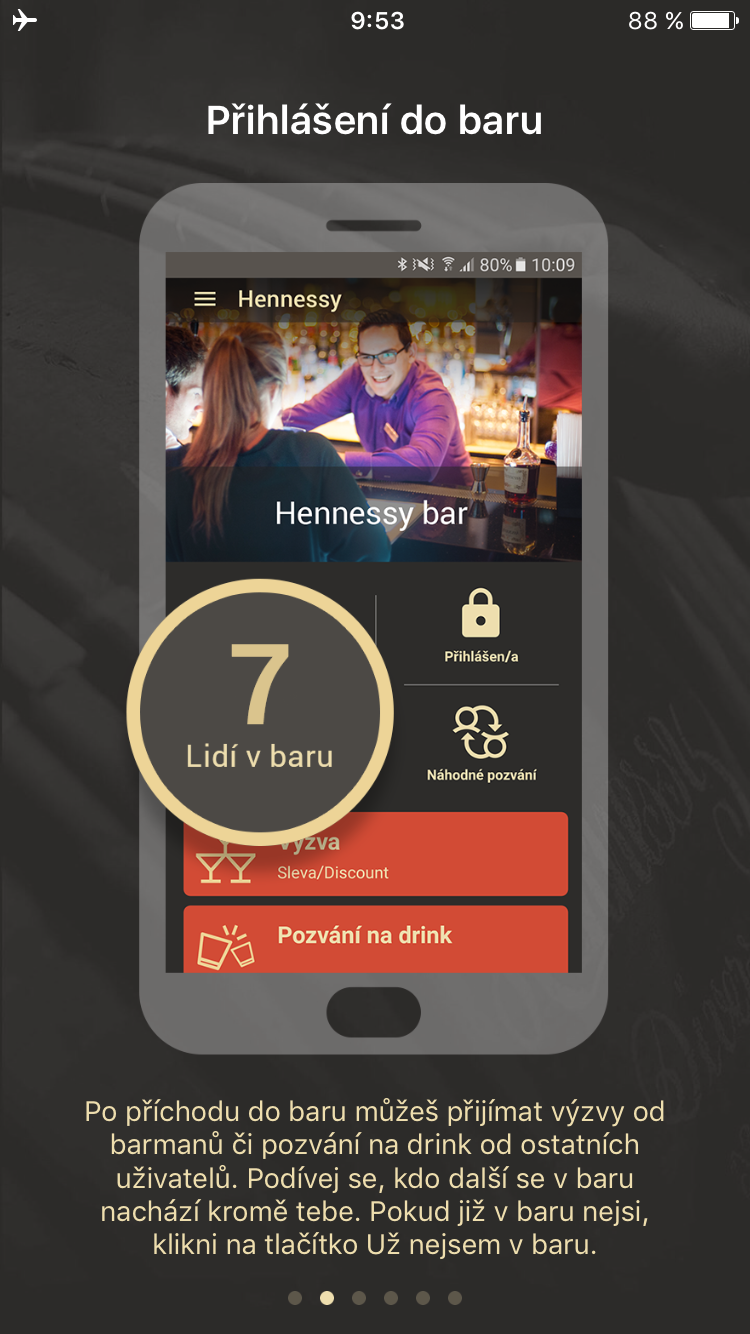 Aplikace vám také umožní využít právě probíhající akce v baru, přihlášeným zobrazí upozornění na aktuálně probíhající slevovou akci v baru. Můžete například obdržet pozvánku barmana ke společnému přípitku anebo jinou výzvu daného podniku.