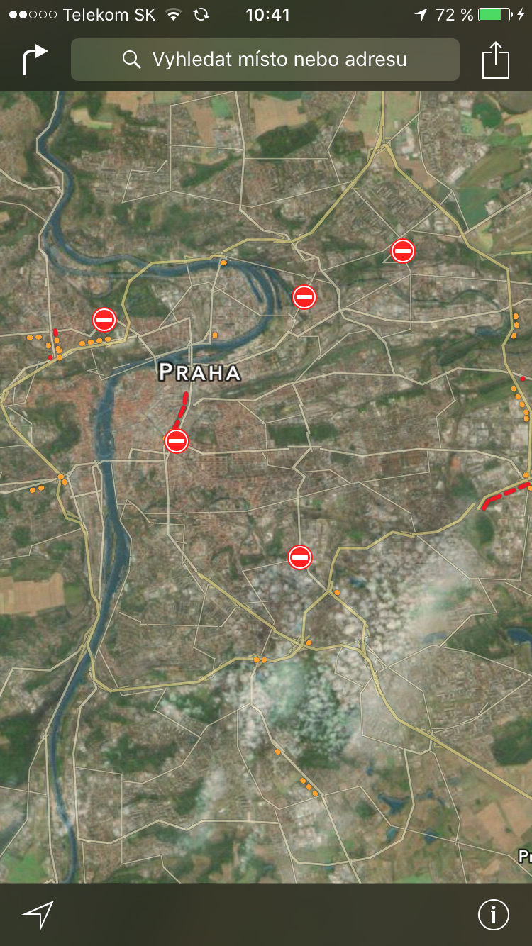 Otázkou však je odkud Apple Maps berou informace, protože tam kde je provoz zhruba jedno auto za patnáct let se ukazuje oranžová, tedy mírné zdržení i když jste na cestě sami. Apple Maps sice nabízí možnost přidat informace o zdržení nebo opravě přímo od uživatelů, ovšem těch je prozatím tak málo, že upřímně doufáme v to, že Apple bere data ještě někde jinde. Bohužel informací je prozatím skutečně žalostně málo a třeba v Praze je jen pár uzavírek a nic se neopravuje, což se v Praze od Karla IV. ještě nestalo.