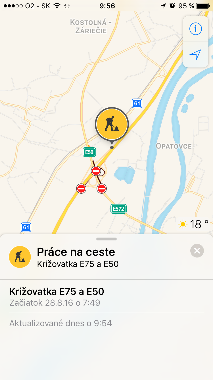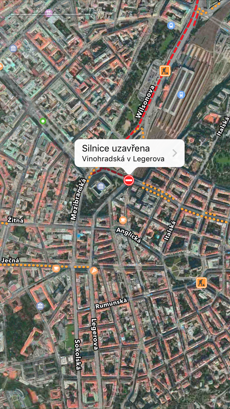 To je novinka? To už je v Apple mapách minimálně rok. Uzavírky, práce na silnici, dokonce nehoddy! A i červené a oranžové pruhy s dopravní situací. Jen minulý měsíc při cestě z dovolené jsem sledoval, jak se přede mnou (živě) na D1 tvoří kolona, a když jsem do ní dojel, jak se rozšiřuje ještě za mě. Navigace podle toho i prodlužovala odhad přijezdu do cíle. Jediné, s čím Apple mapy při navigaci asi nepočítají, je rychlost.