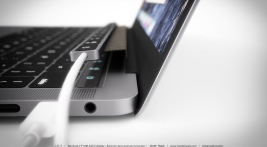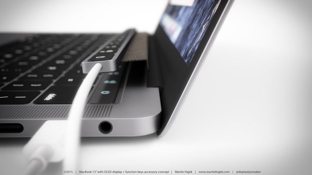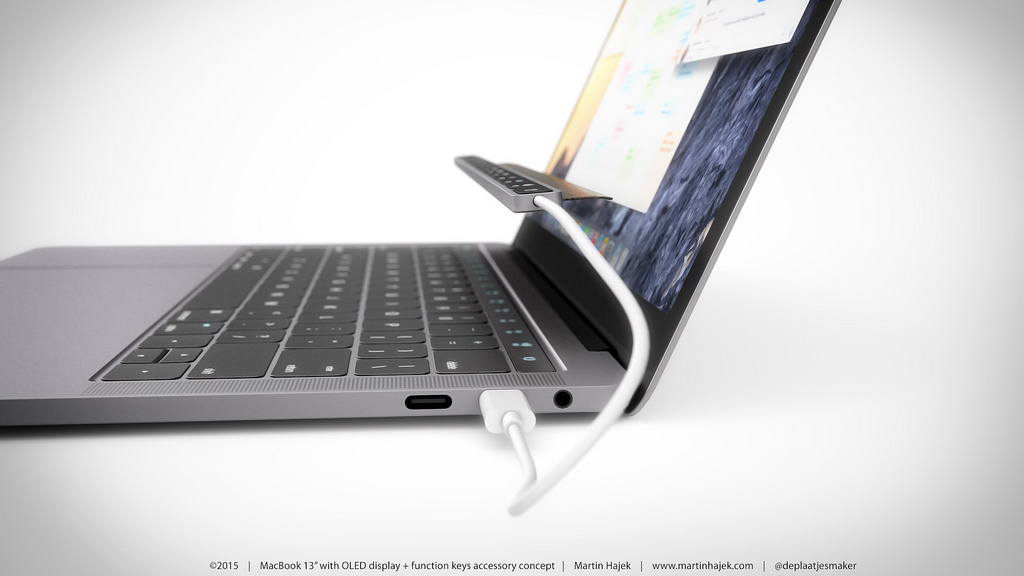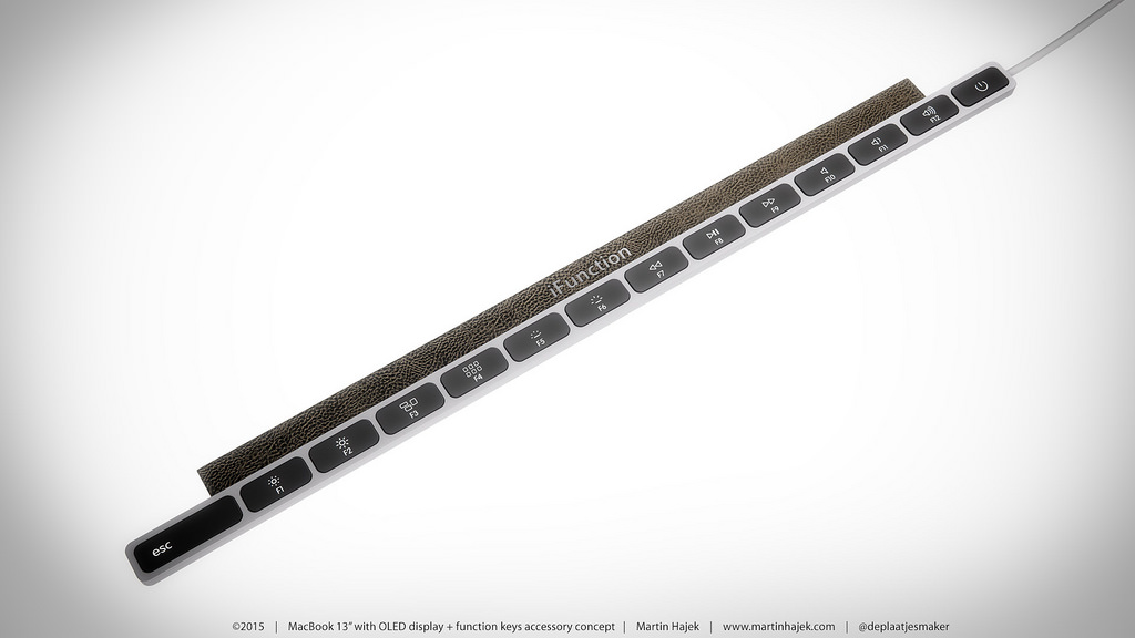 Martina však napadlo, že ne každému by muselo vyhovovat nahrazení funkčních kláves „F“ OLED displejem a tak vytvořil koncept příslušenství pro MacBook Pro 2016 s názvem iFunction. Jedná se o klávesnici do USB, kterou jednoduše připojíte a položíte na OLED displej. Pokud tedy netoužíte po OLED displeji, máte možnost jej nahradit klávesami. Otázkou je jen to, proč by někdo kupoval nový MacBook Pro s OLED displejem aby následně nahradil jeho OLED displej za klasické klávesy. MacBook Pro 2016 s OLED displejem a ani iFunction samozřejmě nejsou prozatím představeny a jedná se pouze o rendery z dílny Martina Hájka.