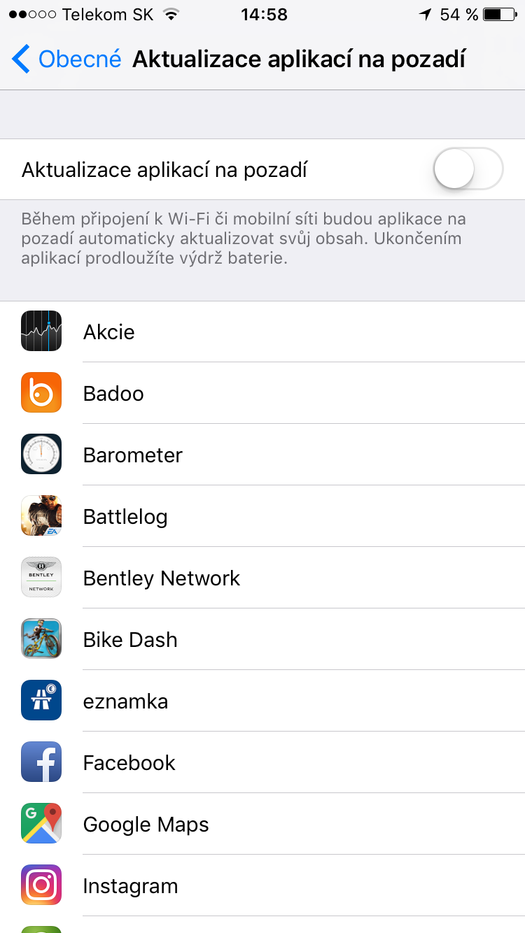 Ve svém iOS zařízení přejděte do Nastavení – Obecné a zvolte možnost Aktualizace aplikací na pozadí. Tím vypnete funkci, díky které se automaticky aktualizují údaje o počasí a akciích. Sám Apple přitom v popisu této funkce upozorňuje na fakt, že jejich vypnutí prodloužíte výdrž baterie. Pokud navíc probíhá aktualizace, může zejména u starších zařízení dojít ke zpomalení iOS. Vypnutím této funkce nejen zrychlíte iOS, ale také prodloužíte životnost baterie ve vašem zařízení.