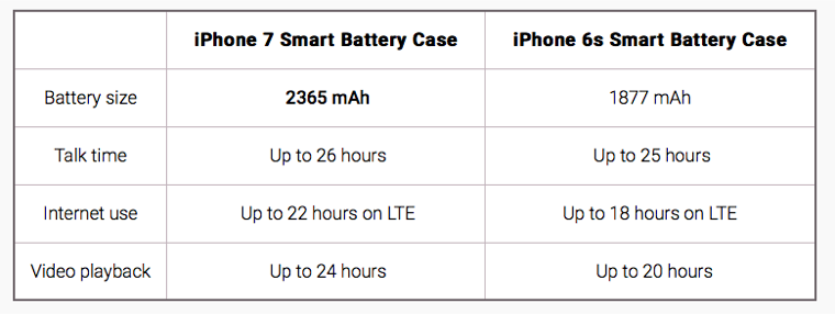 Na první pohled by se mohlo zdát, že se Smart Battery Case pro iPhone 7 od toho pro iPhone 6/6s v podstatě nezměnil, ale nebyla by to pravda. V první řadě se změnila kapacita verze pro iPhone 7 má 2365 mAh baterii, zatímco verze pro iPhone 6s má baterii s kapacitou 1877 mAh. Nárůst velikosti baterie tak zajistí o hodinu delší výdrž při hovorech, o 4 hodiny při brouzdání na LTE a 4 hodiny při přehrávání videa.