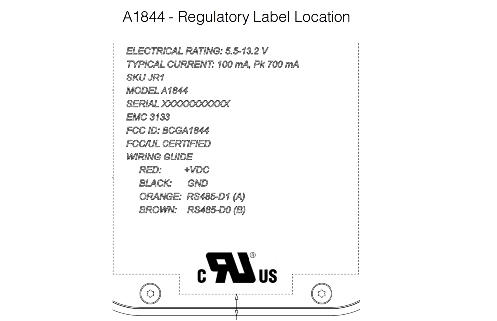 V dokumentaci se o věci referuje pouze jako bezdrátové zařízení s modelovým číslem A1844 a jediné, co je o zařízení konkrétně známo, je konektivita Bluetooth a NFC. Zařízení má také nízkou spotřebu mezi 100 mA a 700 mA a mezi 5,5 V a 13,2 V. Pro porovnání se současná Apple TV pohybuje na 12 V a 0,917 A a iPhone na 5 V a 2,4 A. Pod štítkem s údaji jsou už viditelné pouze 2 torx šroubky. Jejich pozice naznačuje malou velikost zařízení podobnou třeba Apple TV.
