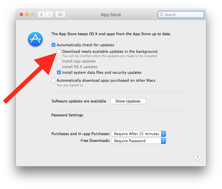 - Odškrtněte volbu automatického stahování nově dostupných aktualizací na pozadí. Tato možnost umožní počítači hlídat nové aktualizace, ale zabrání mu v jejich automatickém stahování. Tato možnost je pro uživatele přívětivější, jelikož budou na nové aktualizace stále upozorňováni a nestane se, že si jich nevšimnou. Pokud tak chtějí některou z aplikací aktualizovat, stačí ji v App Store manuálně stáhnout.
