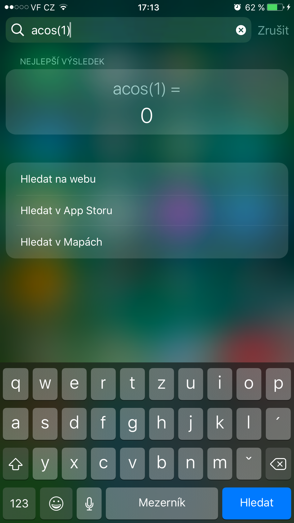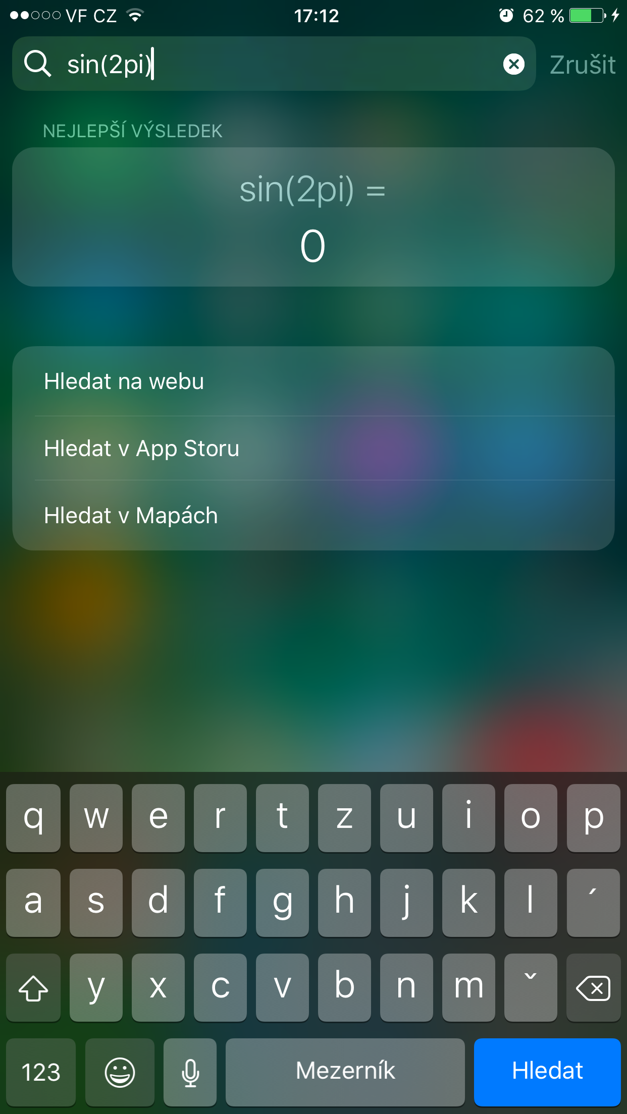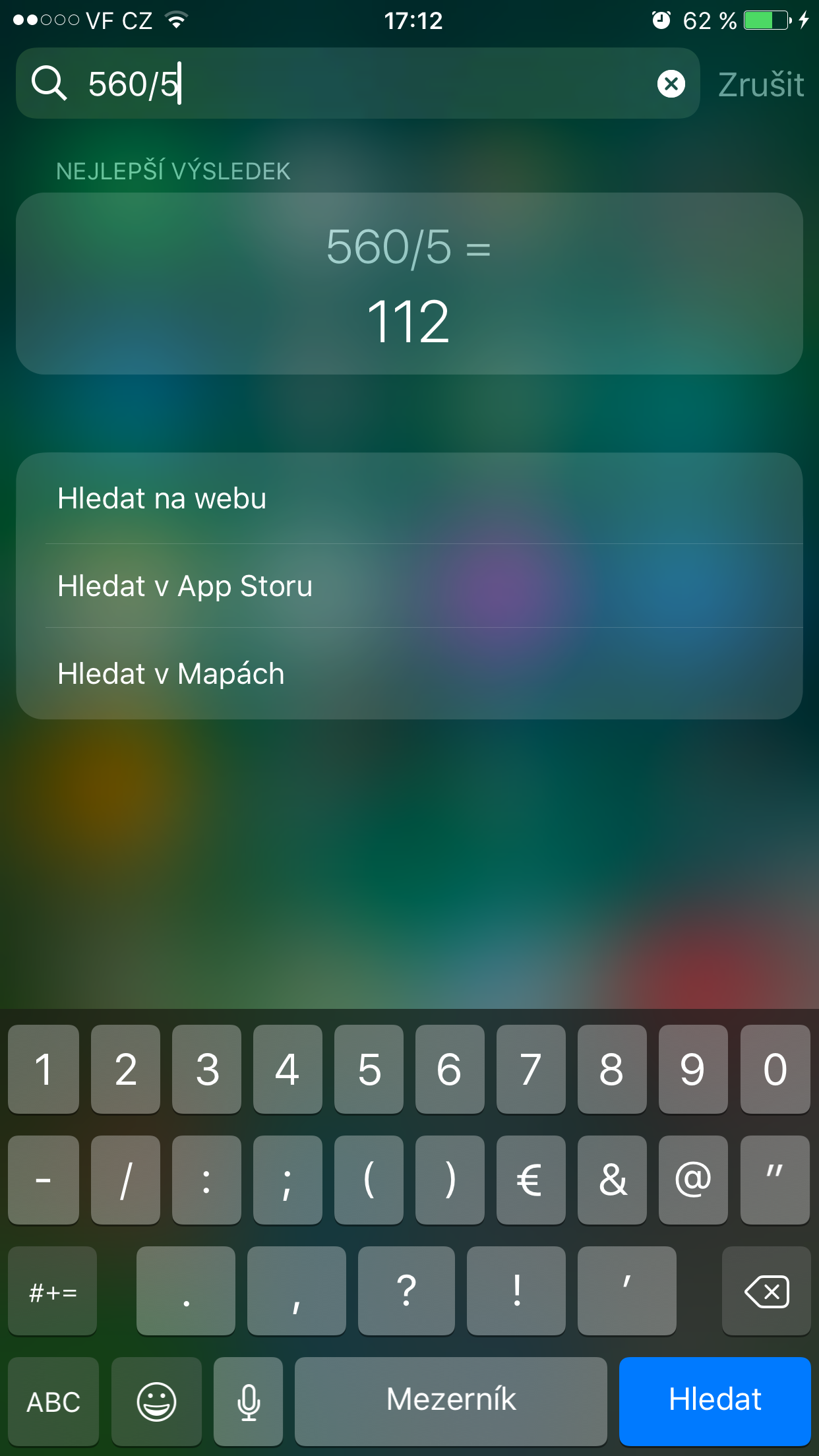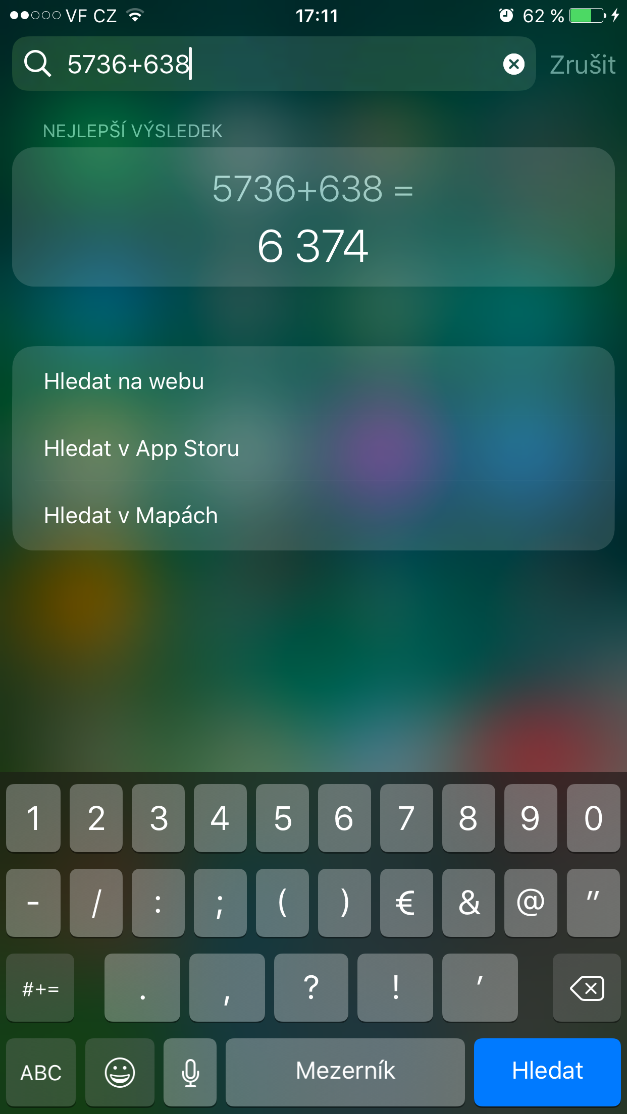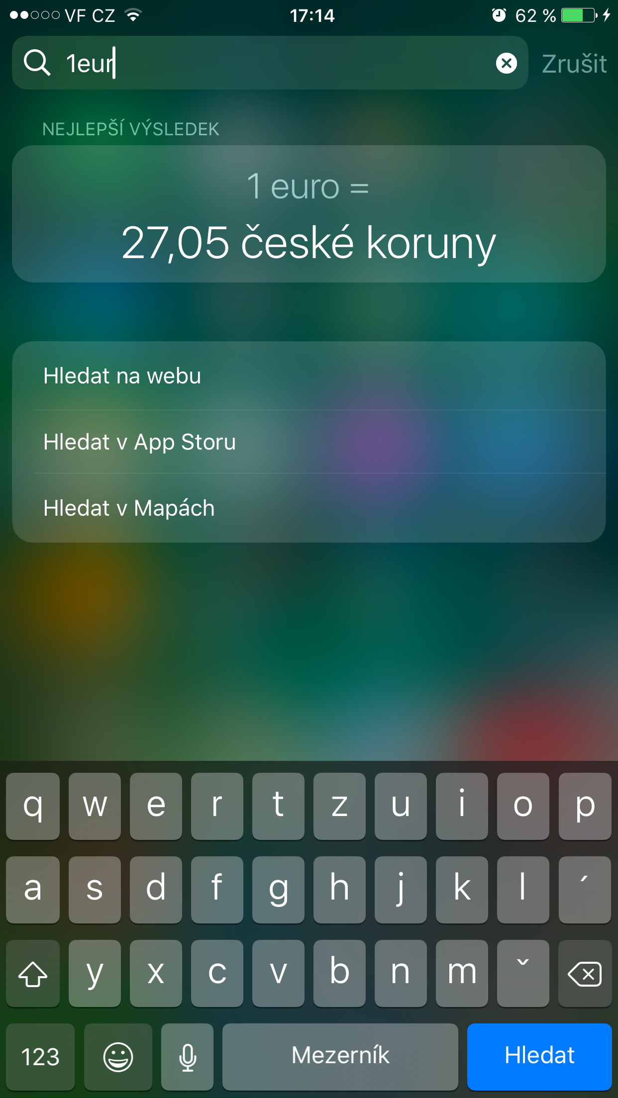 Prvním krokem bude samotné otevření Spotlightu. Do něj se lze dostat jednoduchým posunem prstu směrem dolu na domovské obrazovce. Na iOS 10 se dá Spotlight otevřít i ze stránky s Widgety i v Notifikačním centru. Pak už stačí do vyhledávání zadat náš dotaz a jako odpověď dostaneme výsledek.