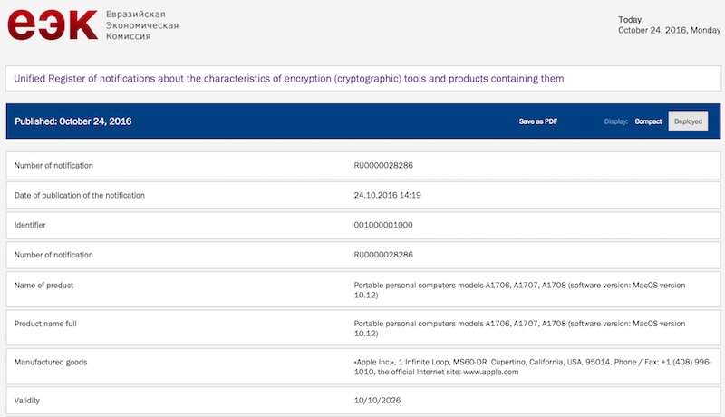 Jen tři dny před samotnou konferencí „Hello again“, kde má Apple představit nový MacBook Pro a další Macy, zjistila francouzská stránka Consomac, že si Apple nechal zaregistrovat hned tři své nové počítače, které již brzy spatří světlo světa. Web našel zmínky v ruské databázi Euroasijské hospodářské komise. Apple si musel nechat produkty zaregistrovat kvůli ruským požadavkům, které požadují, že společnosti musí nahlásit všechny produkty, které obsahují šifrovací a/nebo kryptografické nástroje.