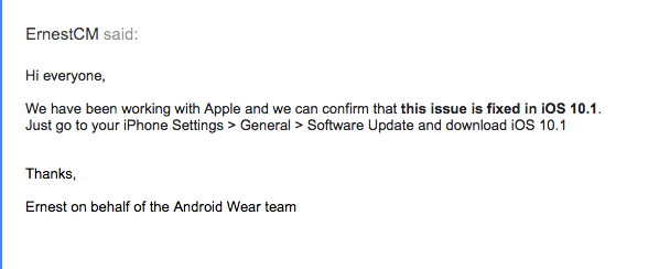 Na nápravě spolupracoval Apple s vývojáři z Android Wear týmu a výsledek jejich práce se projevil včera. Uživatelé již nemají problém své chytré hodinky s telefonem propojit. Všechny zákazníky následně ujistil ještě zástupce Android Wear developer týmu, ErnestCM, který na internetu vyvěsil oficiální stanovisko společně s návodem, jak vlastně Apple zařízení na nejnovější verzi iOS aktualizovat. Jak je psáno výše, nová aktualizace iOS 10.1 je dostupná pro iPhony a iPady již od včerejška.