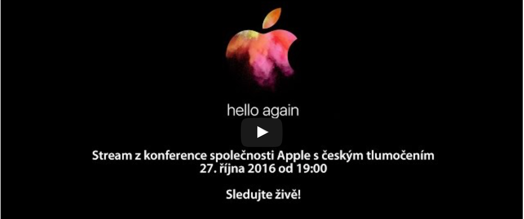Právě proto je tu přímý přenos Apple Hello Again s českým tlumočením, který můžete sledovat přímo v tomto článku na videu níže a to ve čtvrtek 27. 10. 2016 od 19:00, kdy začíná samotná akce Hello Again od společnosti Apple.