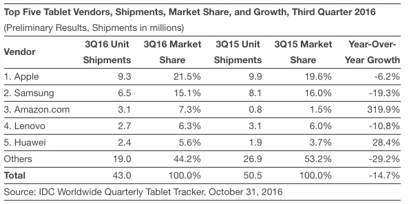 I ve třetím kvartálu roku 2016 pokračuje pokles celosvětového prodeje tabletů. Infromovala o tom společnost International Data Corporation. Ta zároveň přinesla i informaci o tom, že nejnovější tablety od Applu nepatří mezi ty nejpopulárnější. Apple uvedl iPady Pro na trh jako odvážnou náhradu počítačů, zákazníci však i nadále dávají u nákupu přednost iPadu Air 2 a iPadu mini 4.