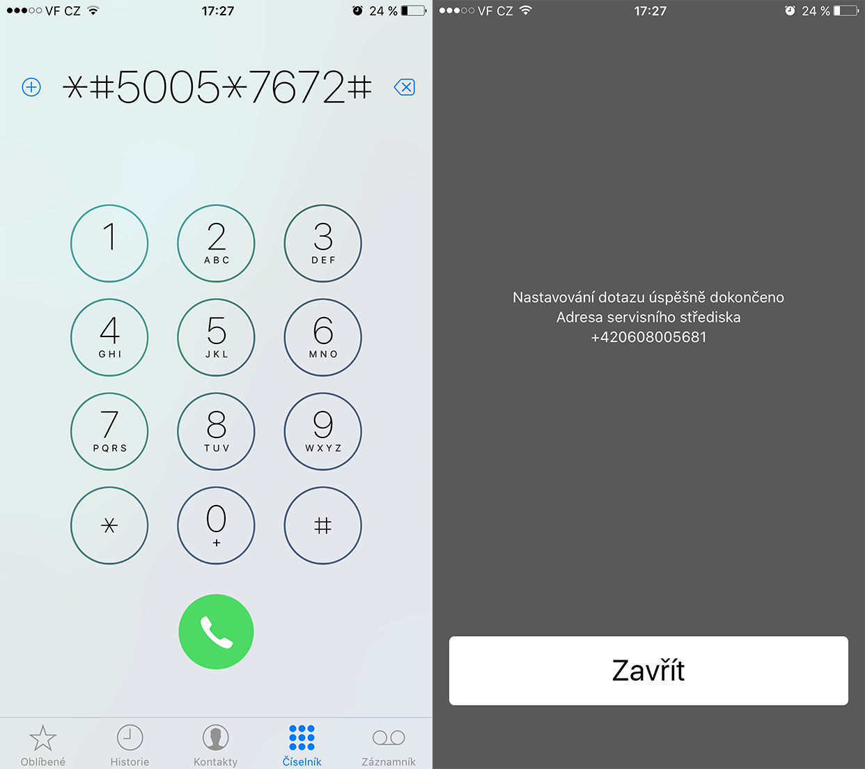 Pro zobrazení čísla na servisní středisko operátora zadejte na číselníku kód *#5005*7672# a stiskněte tlačítko pro zahájení hovoru.