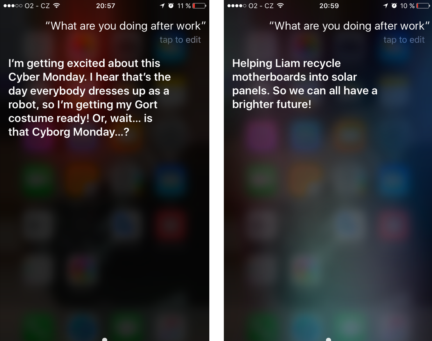 Odpověď na otázku „jak stará jsi?“ zněla „jsem stará jako východní vítr a mladá jako právě narozená housenka“. A vtipů umí Siri opravdu hodně! Bavili jsme se jimi celý večer!
