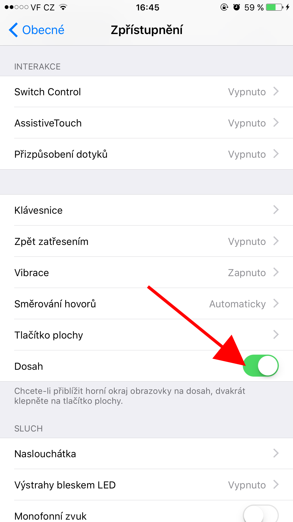 Při aktivaci funkce dvojitým poklepáním na domovské tlačítko se tak obraz celý posune dolu a uživatel může stisknout tlačítka na horní straně. Po provedení akce se pak obraz na displeji opět vrátí do původní polohy. Někdy však můžete funkci Dosah aktivovat omylem, což se může stát velmi otravným omylem. Obzvláště pak pokud funkci vůbec nepoužíváte.