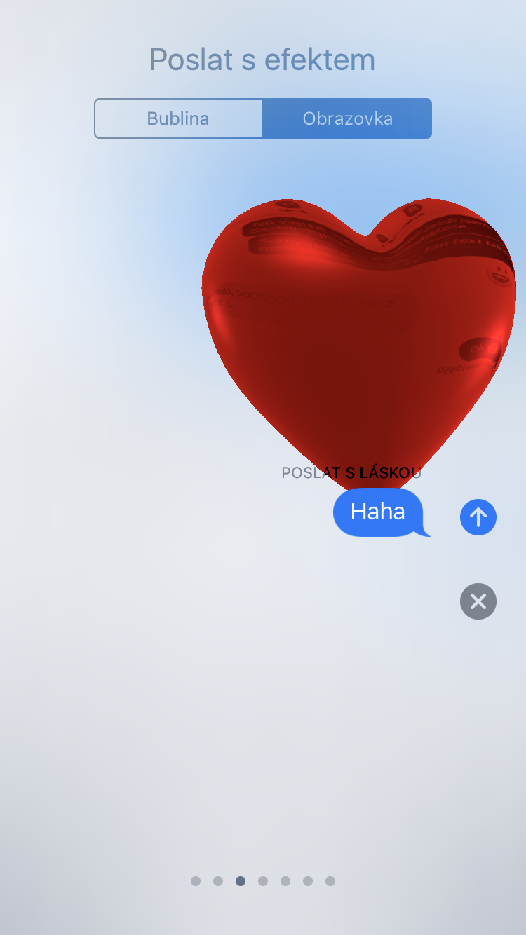 - V aplikaci Zprávy je nový efekt nafukovacího srdce přes celou obrazovku. Pokud jej pošlete, tak se srdce nafukuje a iPhone vibruje tak věrohodně, že vám skutečně přijde, že se nafukuje celý telefon. Jak efekt vypadá můžete vidět na snímku obrazovky výše