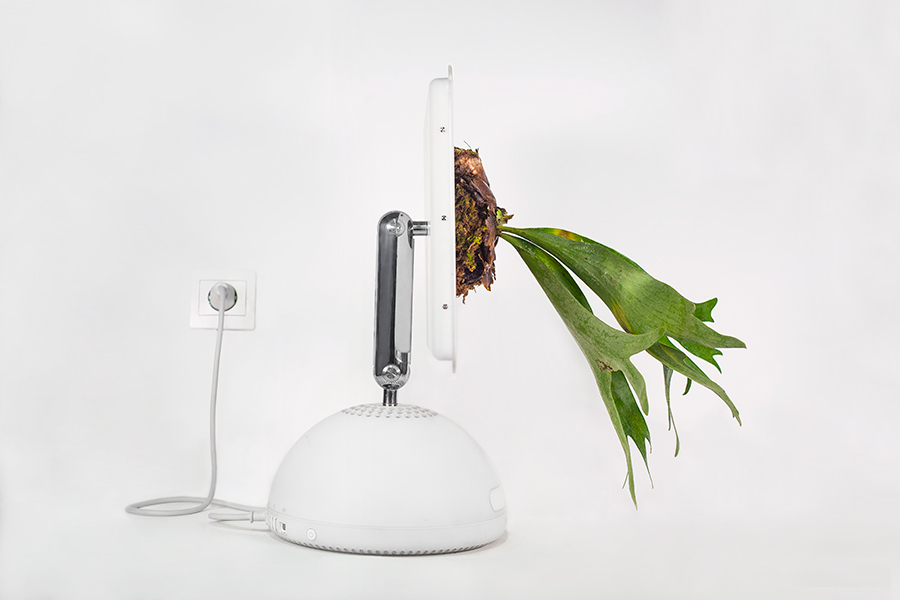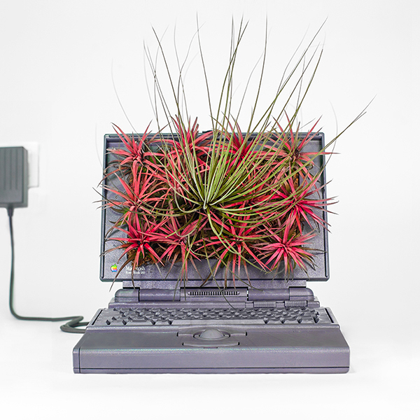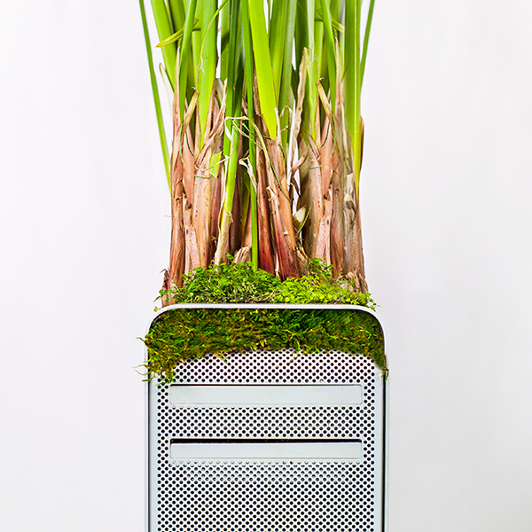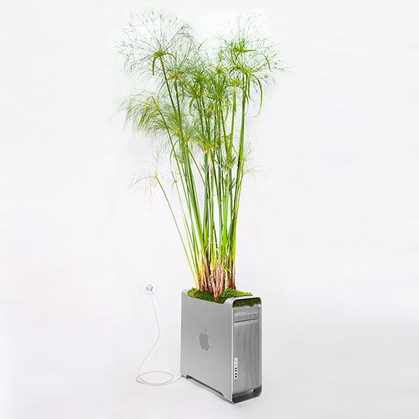 A co že to vlastně udělal? Vzal staré Apple počítače a periferie, vykuchal z nich vnitřnosti a předělal je na velmi specifické květináče pro pestrou škálu zeleně. Na paškál si vzal několik typů Maců. Od Macu Classic, přes G3, G5, Powerbook, myš a tak dále. Jedna z expozic zahrnuje ještě starou disketovou jednotku.