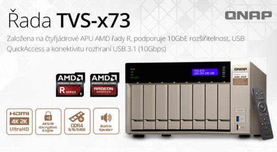 Tisková zpráva: Společnost QNAP Systems uzavřela partnerství s Advanced Micro Devices, a oznámila uvedení řady vysoce výkonných NAS TVS-x73. S čtyřjádrovou APU AMD řady R, až 64 GB RAM, hardwarovým šifrovacím enginem AES-NI, dvěma sloty M.2 SATA 6Gb/s SSD, SSD cache, rozhraním USB 3.1 (10Gbps), rozšiřitelností sítě 10GbE, duálním HDMI výstupem, a hardwarově asistovanou akcelerací dekódování a kódování videí v rozlišení 4K poskytuje řada TVS-x73 malým a středním podnikům dokonalé NAS řešení k vybudování soukromého prostředí cloud pro aplikace jako je vysokorychlostní přenos dat, virtualizace, přehrávání médií a zobrazení grafiky.