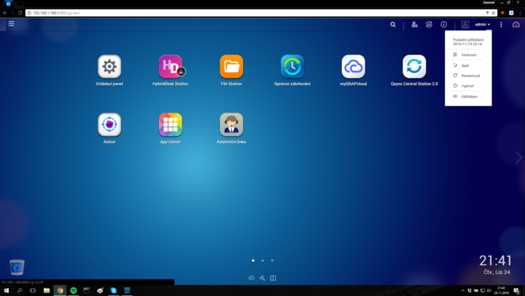 Předinstalované aplikace z výroby jsou k dispozici na ploše, která má celkově tři strany a připomíná plochu dotykového telefonu s Androidem. Tyto aplikace nejsou zdaleka jediné, pro tento QNAP jich existuje slušná řádka ostatních. Rozšiřujícím aplikacím budeme věnovat další článek v budoucnu. Základní nabídka je opravdu základní, najdete zde nejdůležitější programy proto, aby mohlo úložiště pracovat okamžitě, v režimu „out of the box“. Samozřejmostí je tak klasický souborový manažer, zálohovací služby, asistenční služba, antivir, aplikační centrum a HybridDesk Station (aplikace, která z NASu udělá náhradu za klasické PC).