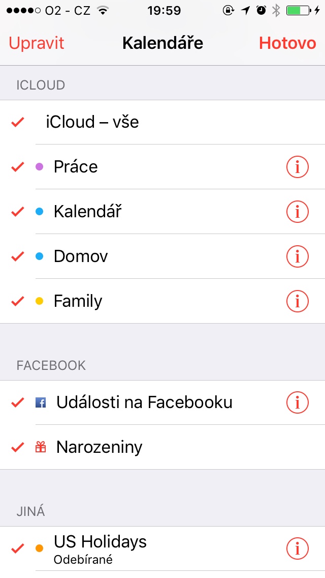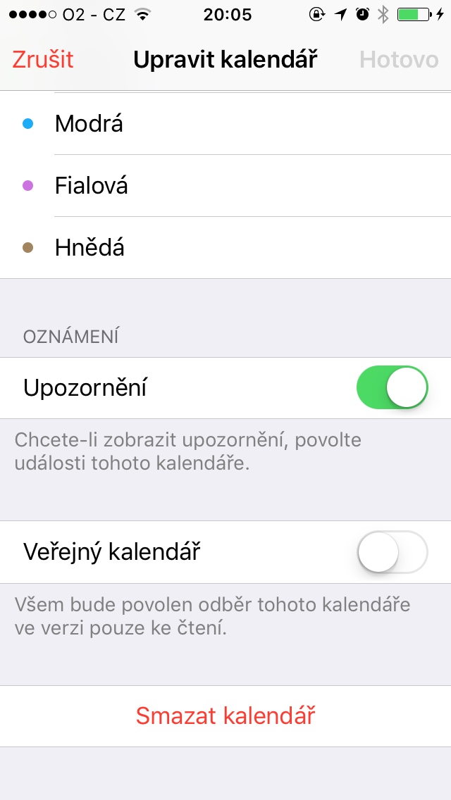 - Vyberte právě vytvořený kalendář, klepněte na symbol “ i“ napravo do názvu kalendáře a zvolte „Smazat kalendář“.