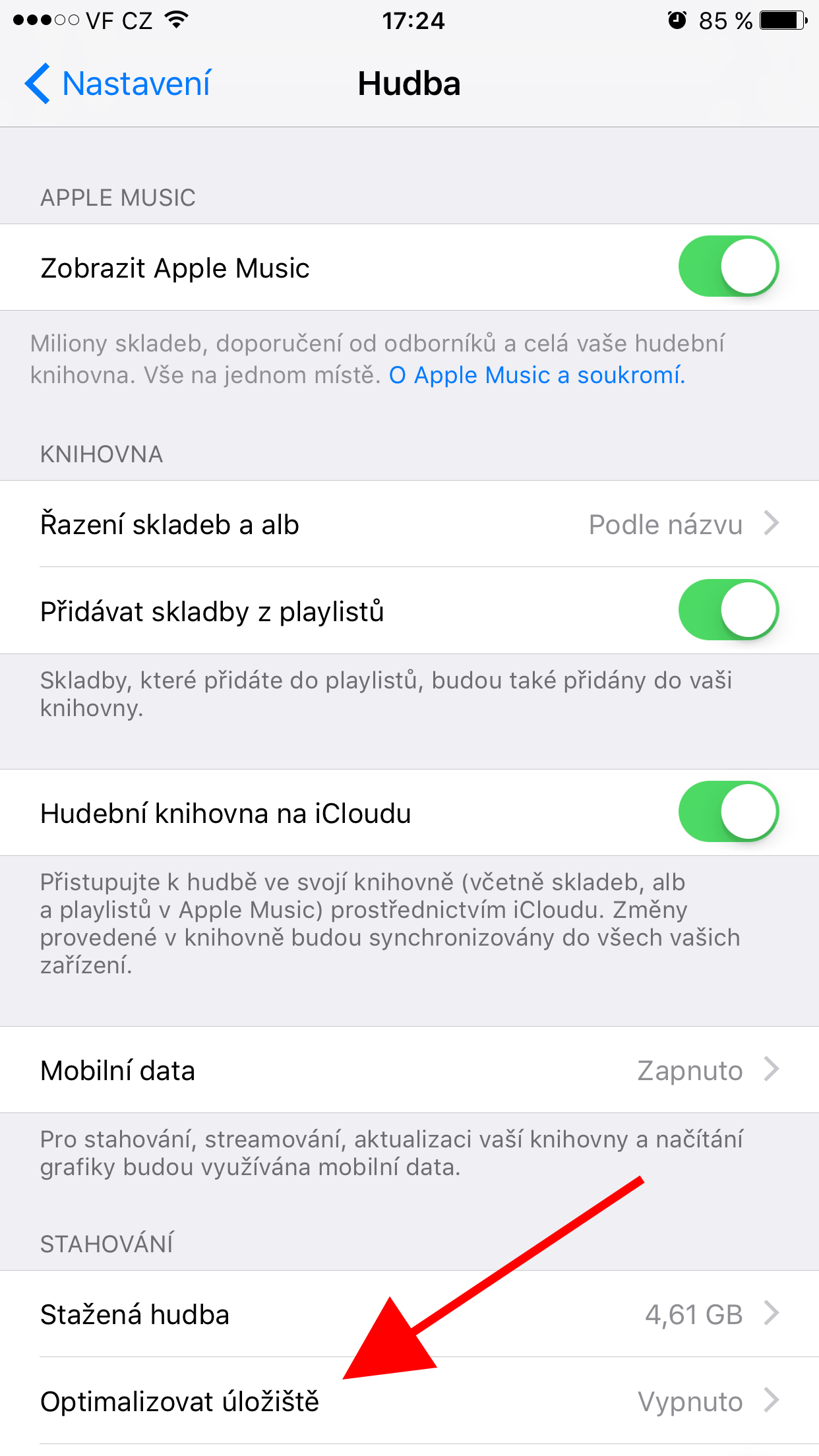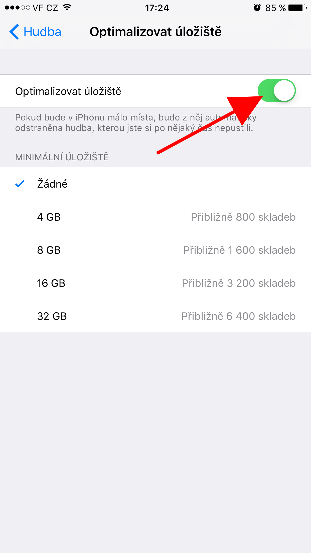 Pokud tuto funkci používat nechcete a vypnete ji, budete muset pro optimalizaci úložiště ve svém zařízení hudbu mazat ručně.