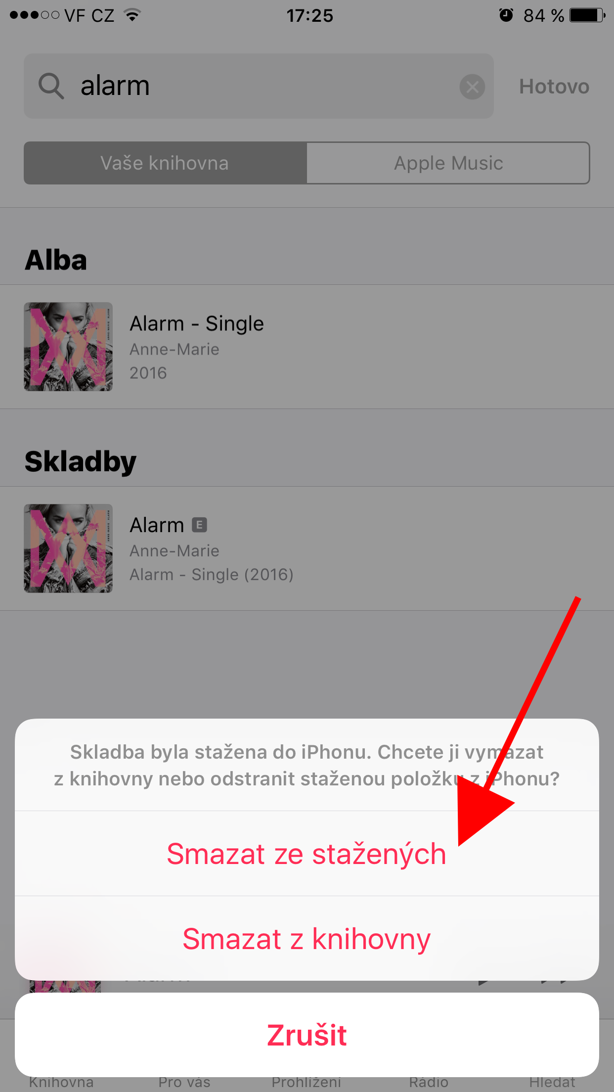 Pokud chcete vymazat všechny skladby od určitého interpreta, otevřete Nastavení a jděte do HudbaStažená hudba a zde klikněte v pravém horním rohu na Upravit. Stisknutím červeného mínus tlačítka a potvrzením odstraníte všechny skladby od daného autora.