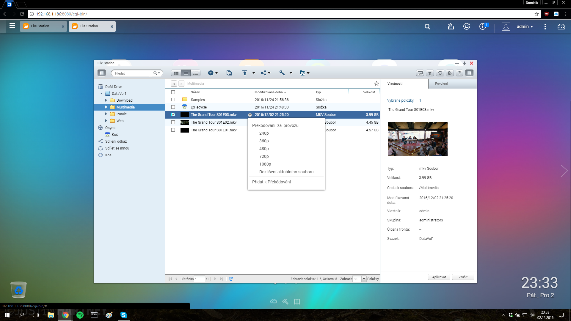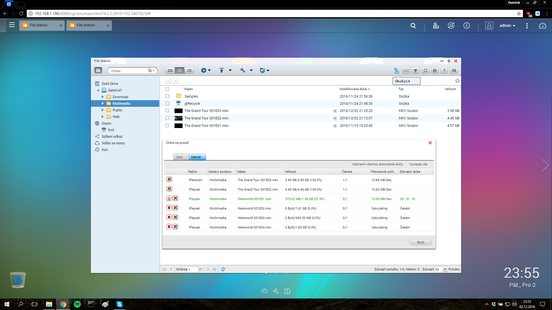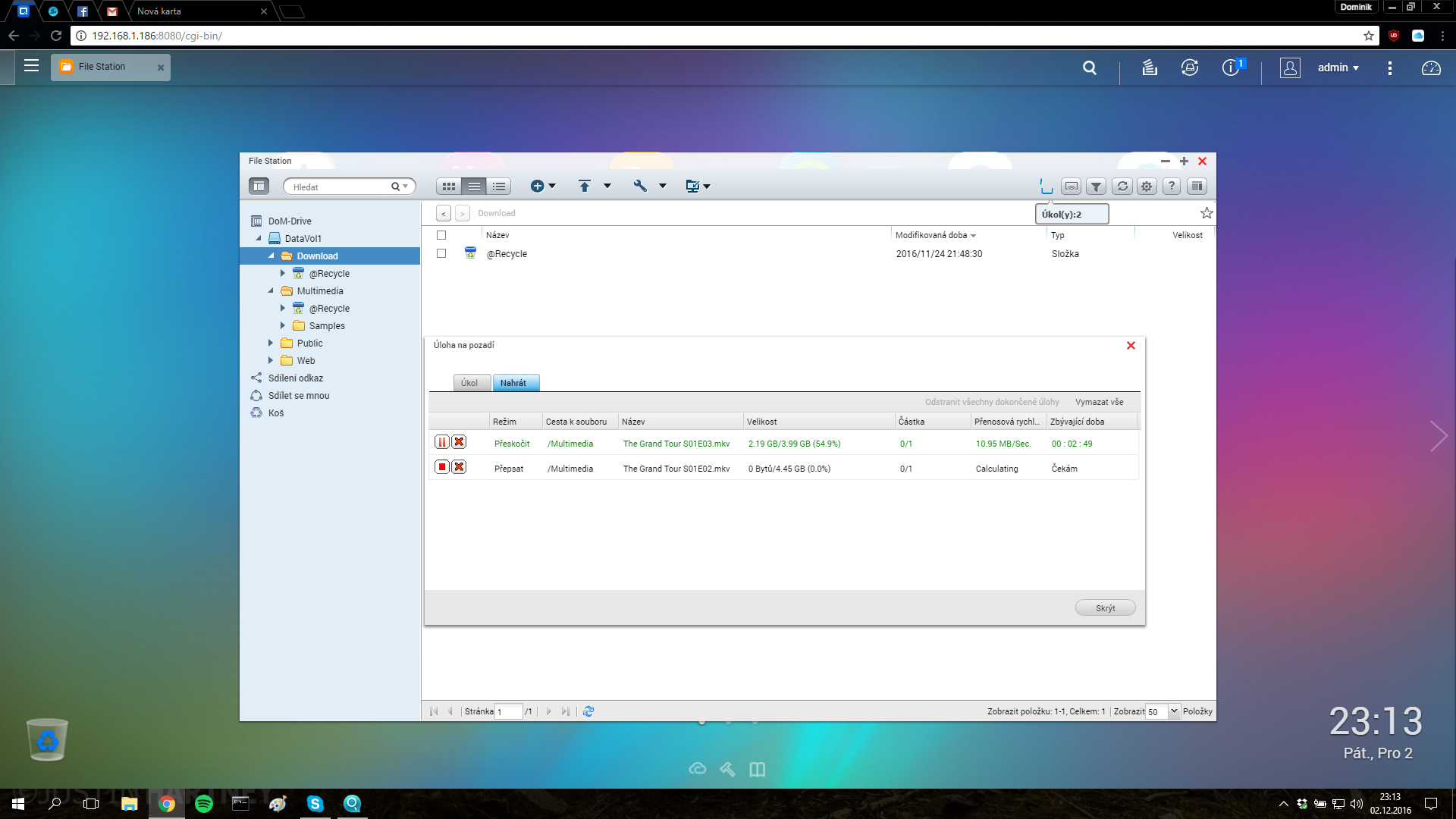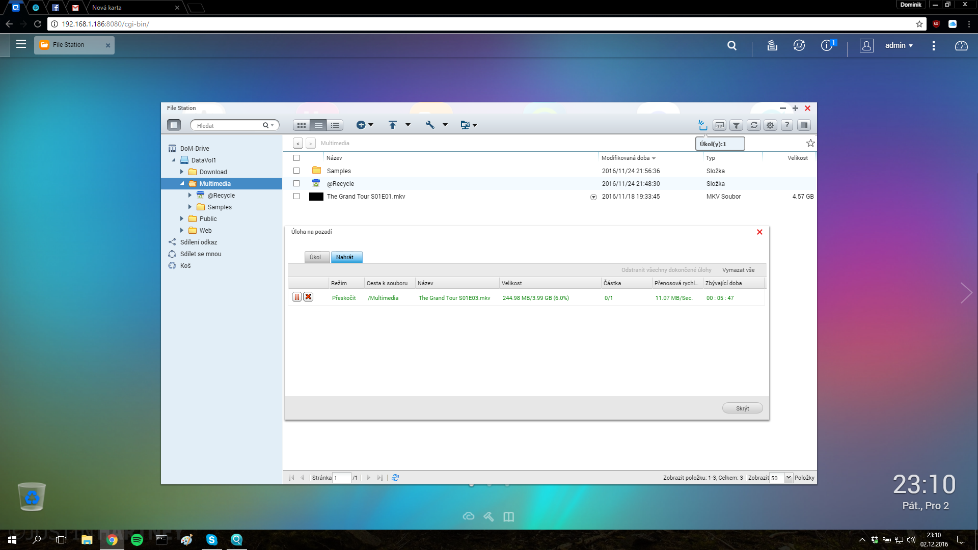Ten se provádí skrze již zmíněný File Station, za pomocí možnosti „nahrát“. Máte k dispozici buď nahrání souboru nebo složky. Osobně jsem si do cloudu uložil první tři díly nové show The Grand Tour. Jedná se o soubory o velikosti od 4 do 5GB a při uploadu přes WAN jsem dosahoval rychlostí kolem 11MB/s. Zde jsem nejspíše narazil na limit svého připojení (100/100 opt). Pokud by bylo propojení PC s NASem řešeno kabelově, hlavním omezením rychlosti by v tomto případě byla rychlost pevného disku uvnitř. V mém případě se jedná o rychlost až 180MB/s (Seagate 1TB NAS HDD). Všechny tři díly byly nahrané zhruba do 15 minut. NAS si vše přebral a upload spustil na pozadí. Během uploadu je tak možné s jednotkou pracovat dále.