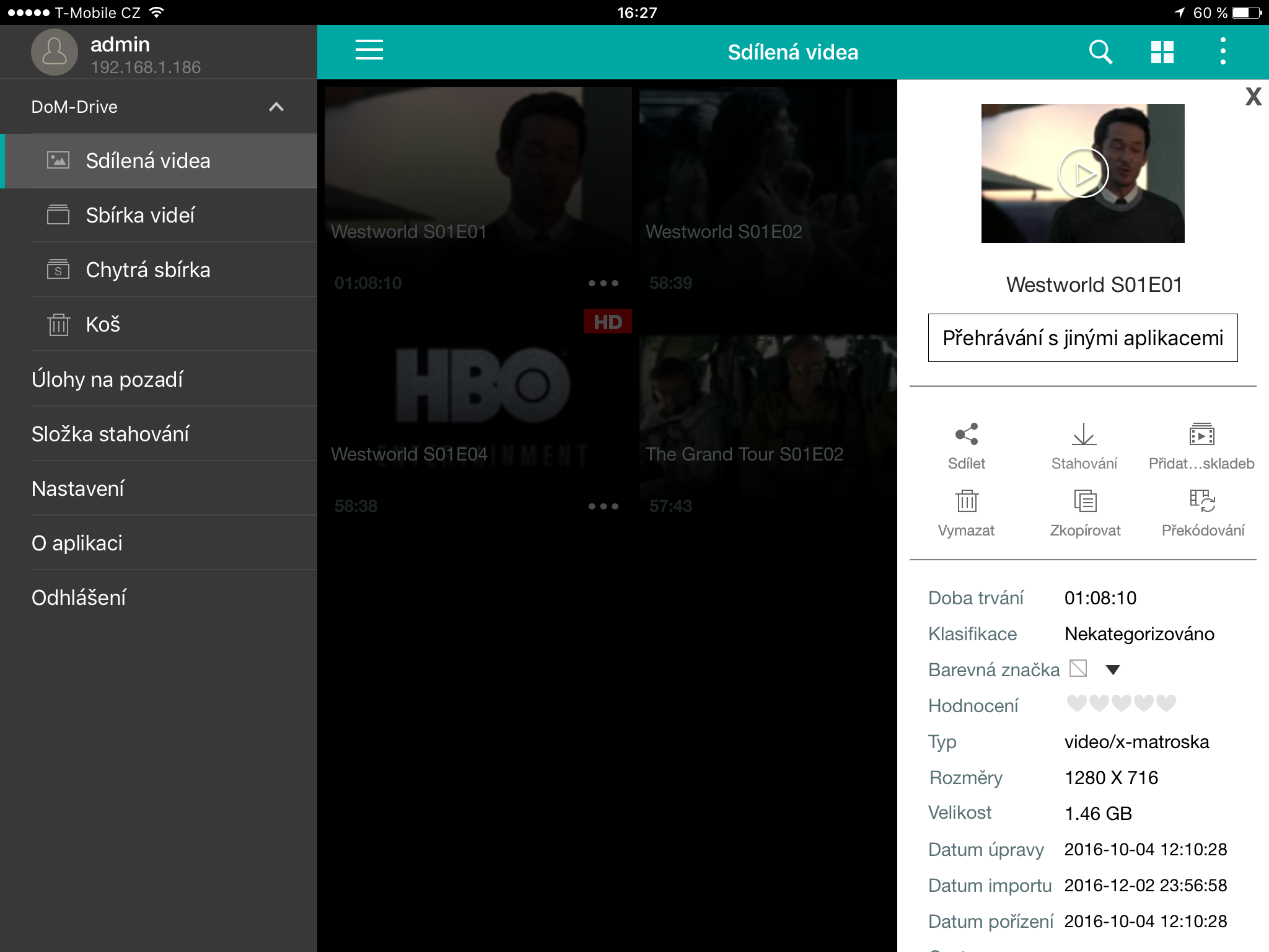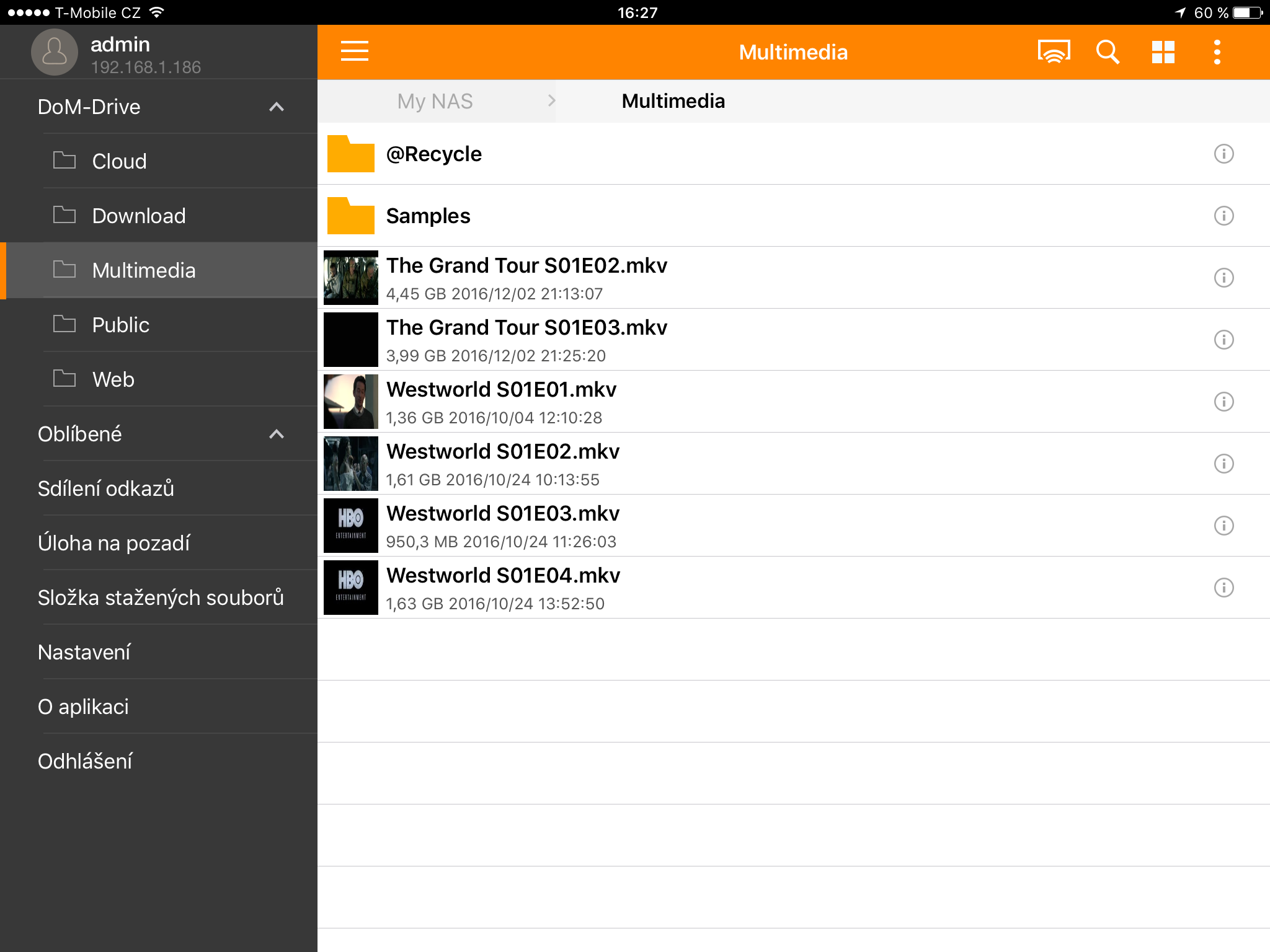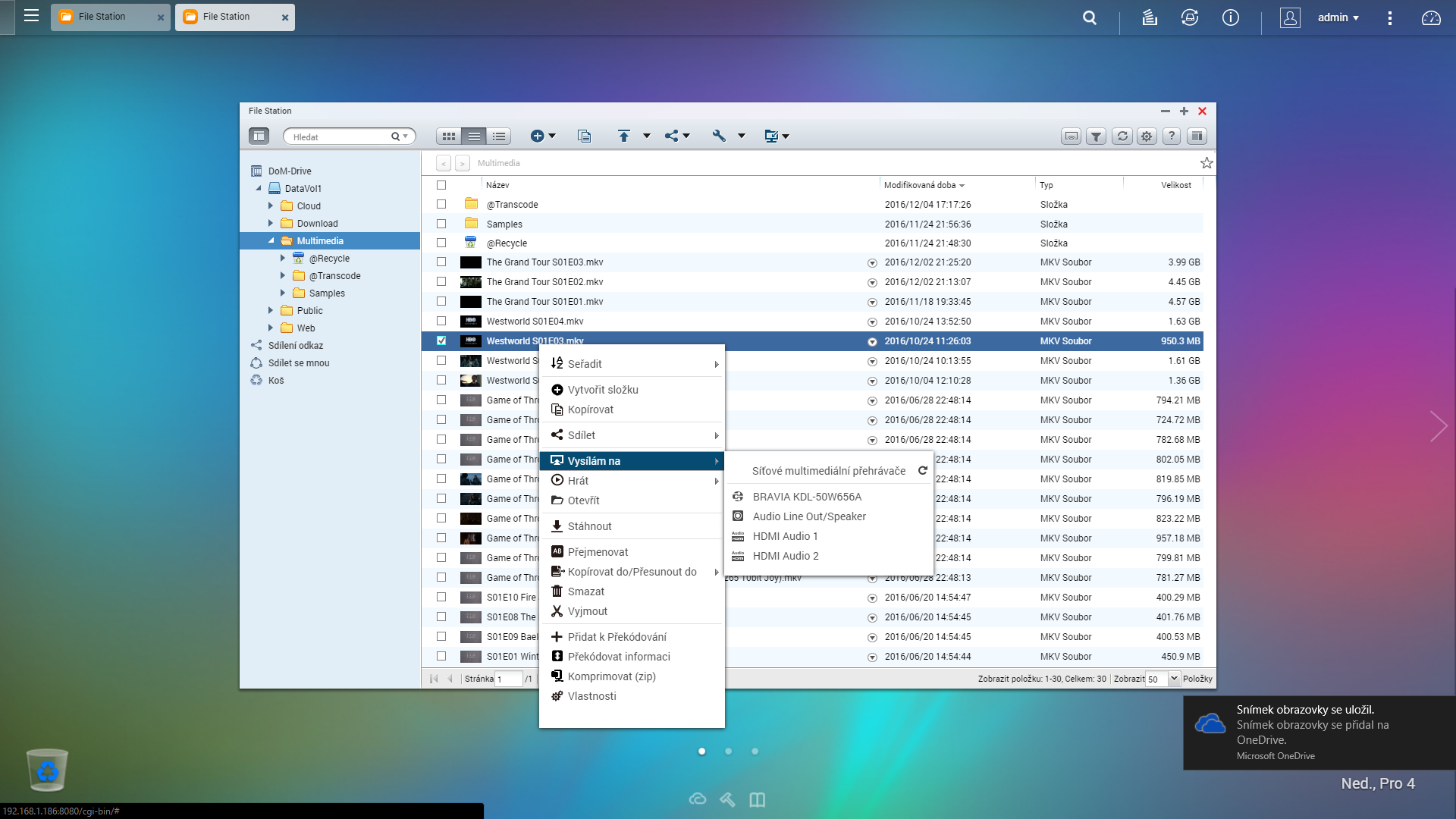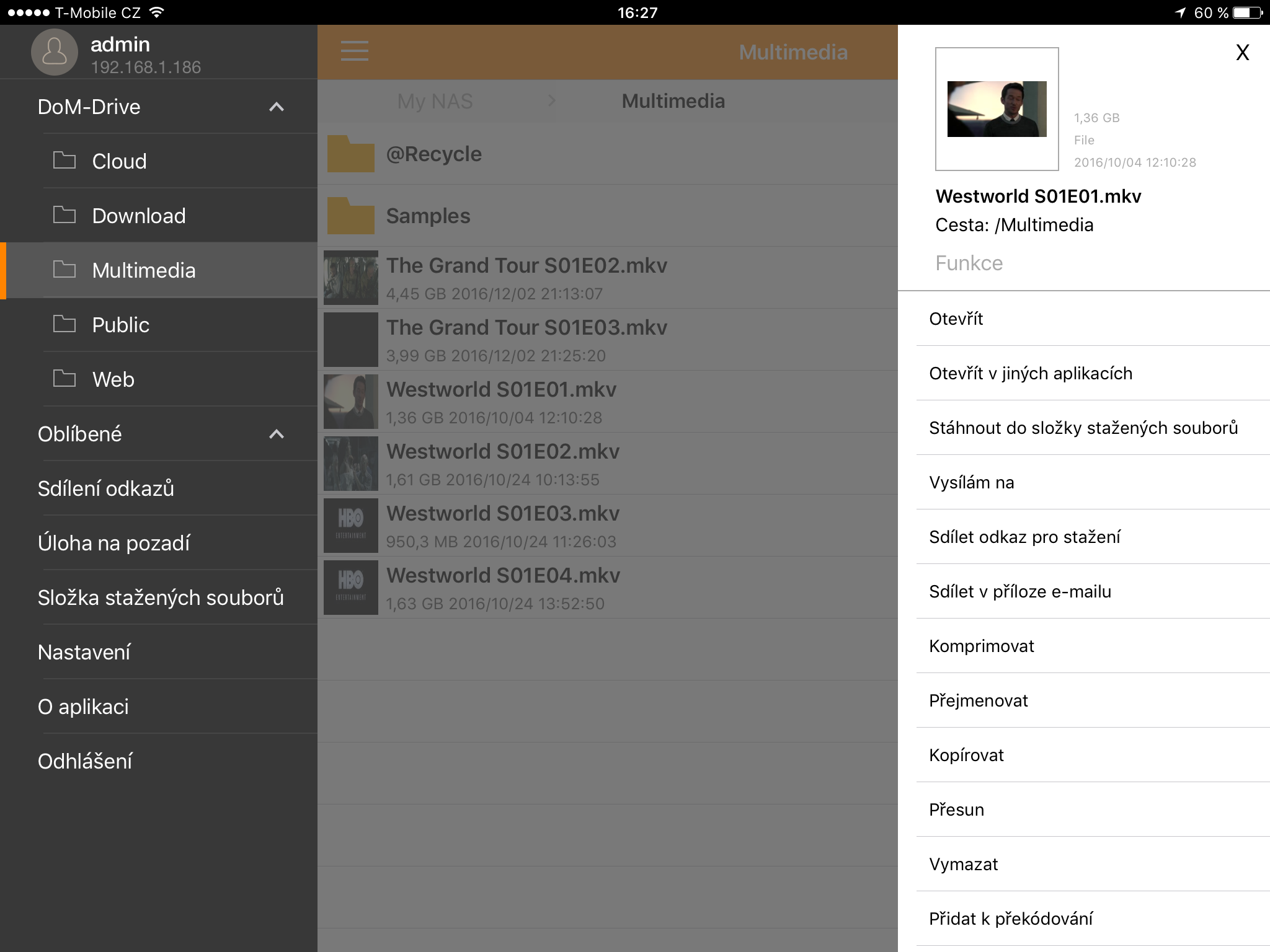 Ten se provádí skrze již zmíněný File Station, za pomocí možnosti „nahrát“. Máte k dispozici buď nahrání souboru nebo složky. Osobně jsem si do cloudu uložil první tři díly nové show The Grand Tour. Jedná se o soubory o velikosti od 4 do 5GB a při uploadu přes WAN jsem dosahoval rychlostí kolem 11MB/s. Zde jsem nejspíše narazil na limit svého připojení (100/100 opt). Pokud by bylo propojení PC s NASem řešeno kabelově, hlavním omezením rychlosti by v tomto případě byla rychlost pevného disku uvnitř. V mém případě se jedná o rychlost až 180MB/s (Seagate 1TB NAS HDD). Všechny tři díly byly nahrané zhruba do 15 minut. NAS si vše přebral a upload spustil na pozadí. Během uploadu je tak možné s jednotkou pracovat dále.