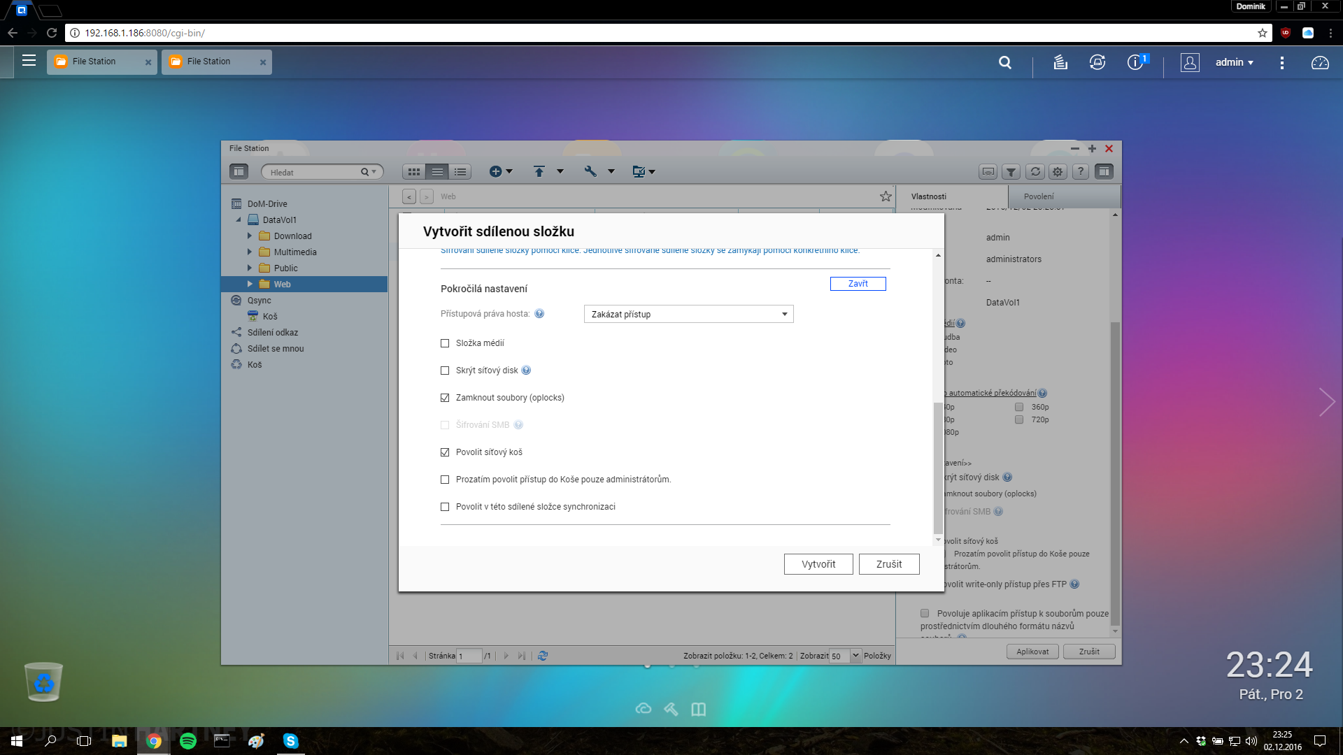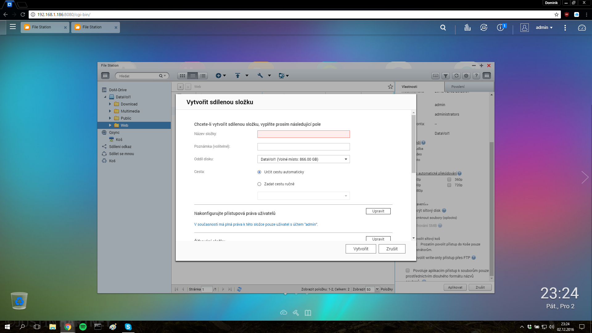 Veškerý souborový management se provádí skrze aplikaci File Station. Ta má veškerý prostor na diskách rozdělený do čtyř defaultních složek a to Download, Multimedia, Public a Web. Tyto čtyři základní složky nejdou smazat, můžete si ovšem vytvořit novou. Vytváření nových složek nabízí obrovskou spoustu nastavení, které si můžete prohlédnout v galerii níže. Od názvu, přes velikost, uživatelská práva, nastavení šifrování a tak dále. Novým složkám se budeme věnovat v jednom z dalších článků, dnes jsme tu kvůli základnímu uploadu.