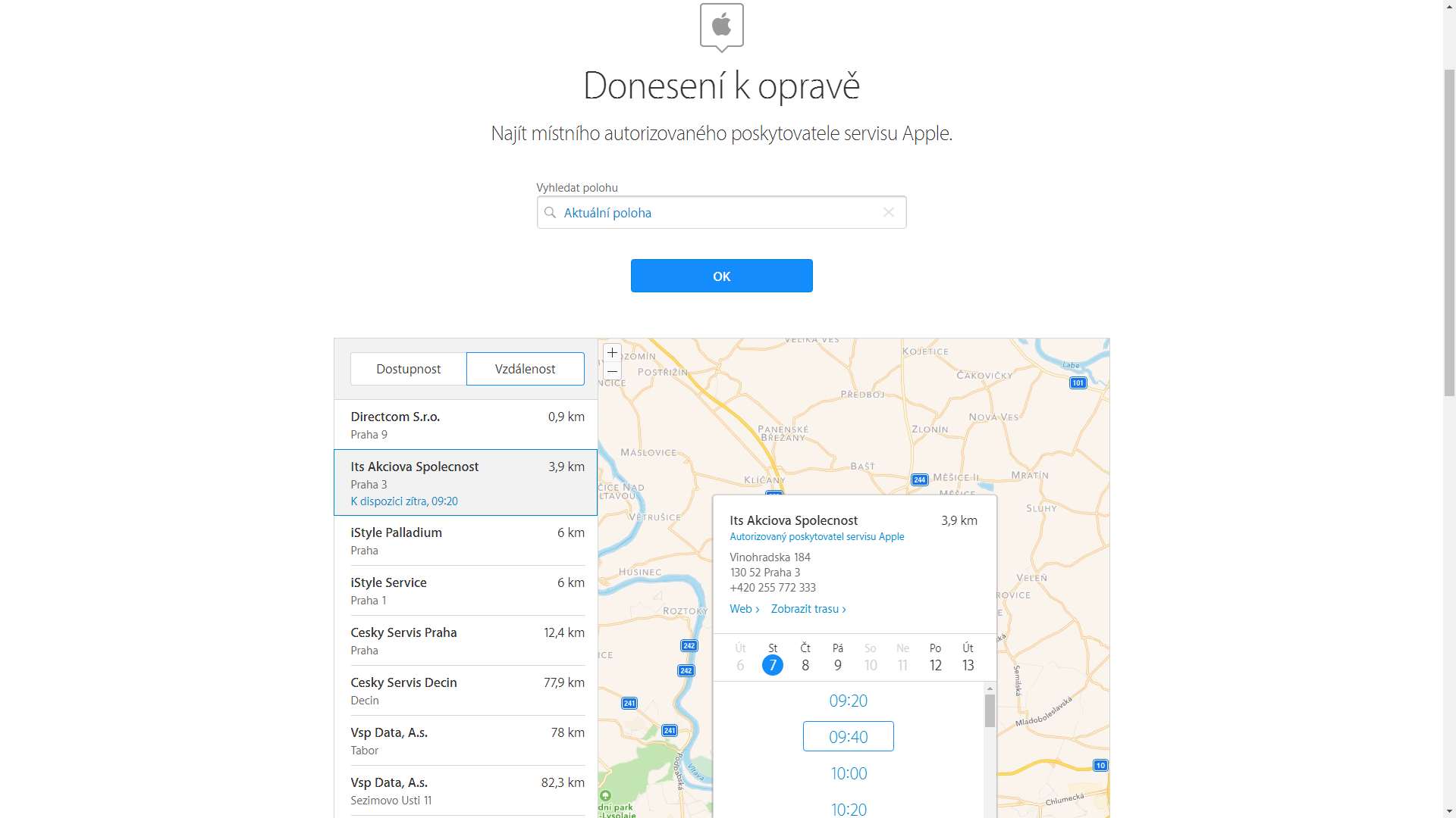 Při hledání pomoci stačí pouze zaškrtnout volbu „donesení k opravě“. Podle vaší polohy, nebo udané adresy, vám web vyhledá nejbližší oficiální autorizované servisy. V rolovacím seznamu si je můžete detailně prohlédnout, jaké mají kontakty, jakou mají otevírací dobu apod. V některých je možné si ihned zarezervovat konkrétní čas návštěvy.