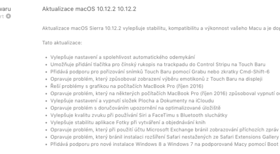 Apple jen před malou chvíli vydal macOS 10.12.2 Sierra pro všechny majitele kompatibilních počítačů Mac. Novou aktualizaci si můžete stáhnout tak, že na svém Macu otevřete aplikaci Mac App Store, kliknete nahoře na záložku Aktualizace, kde už se vám nová verze systému ukáže. Odtud ji stáhnete a následně nainstalujete. Mějte na paměti, že během instalace bude potřeba restart počítače.