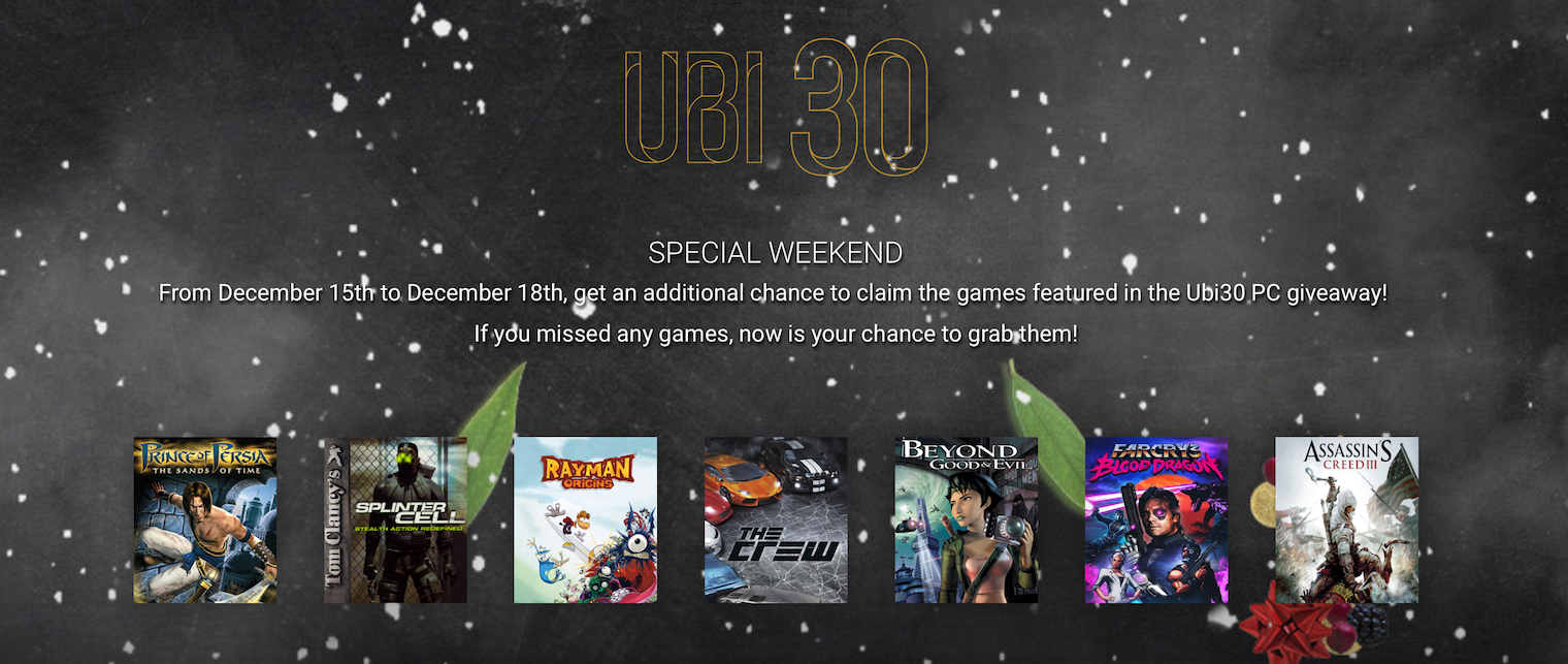Ubisoft letos oslavuje 30 let od svého založení a během celého podzimu rozdával zdarma hry mezi nimiž zářil nejeden prémiový titul. Pokud jste nestihli sledovat celý podzim stránky Ubisoftu a stahovat jednotlivé tituly, máte nyní možnost vše napravit a stáhnout si během následujícího víkendu všechny hry z podzimní akce zcela zdarma! K dispozici jsou tituly Prince of Persia: The Sands of Time, Tom Clancy’s Splinter Cell, Rayman Origins, The Crew, Beyond Good and Evil, Far Cry 3: Blood Dragon a Assassin’s Creed III. Hry můžete stahovat od dnešního dne do 18. 12. 2016 a to přímo přes službu Ubisoft Club.