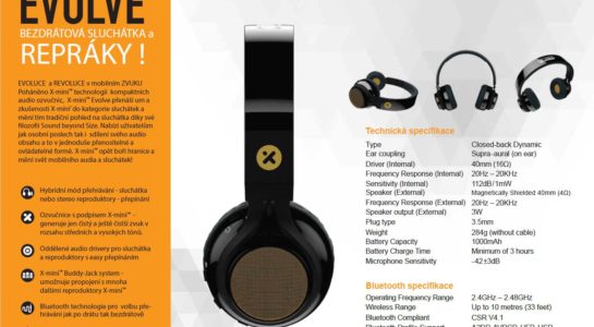 EVOLUCE a REVOLUCE v mobilním ZVUKU poháněna X-mini™ technologií kompaktních audio ozvučnic, X-mini™ Evolve přenáší um a zkušenosti X-mini do kategorie sluchátek a mění tím tradiční pohled na sluchátka díky své filozofii Sound beyond Size. Tato bezdrátová stereo soustava je vybavena i kvalitním mikrofonem pro funkci handsfree a nebo online chat. Má i audio výstup pro zapojení dalších reproduktorů do řetězu – X-mini buddy jack!