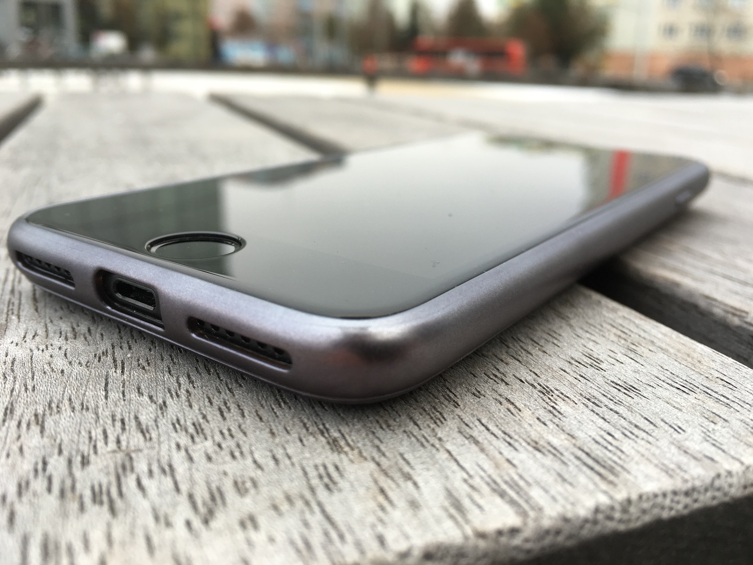 Samotný obal je jak jinak než z plastu, který je po celém obvodu telefonu a kryje i tlačítka pro změnu hlasitosti, která s nasazeným krytem musíte mačkat o něco silněji než bez něj. Výřezy jsou pak pro tlačítko změny režimu vyzvánění, reproduktor, mikrofon, Lightning konektor a samozřejmě na zadní straně, která je transparentní také pro fotoaparát, druhý mikrofon a blesk. Obal příliš nepřesahuje přes displej, takže není problém použít ochrannou fólii nebo sklo. Plastový rámeček který obklopuje tělo telefonu je poměrně pevný a ochrání nejen před nějakým tím škrábnutím nebo ťukancem, ale zvládne dle mého názoru i takové ty drobnější pády z pár desítek centimetrů.