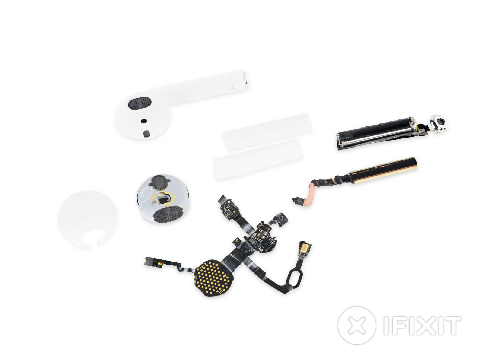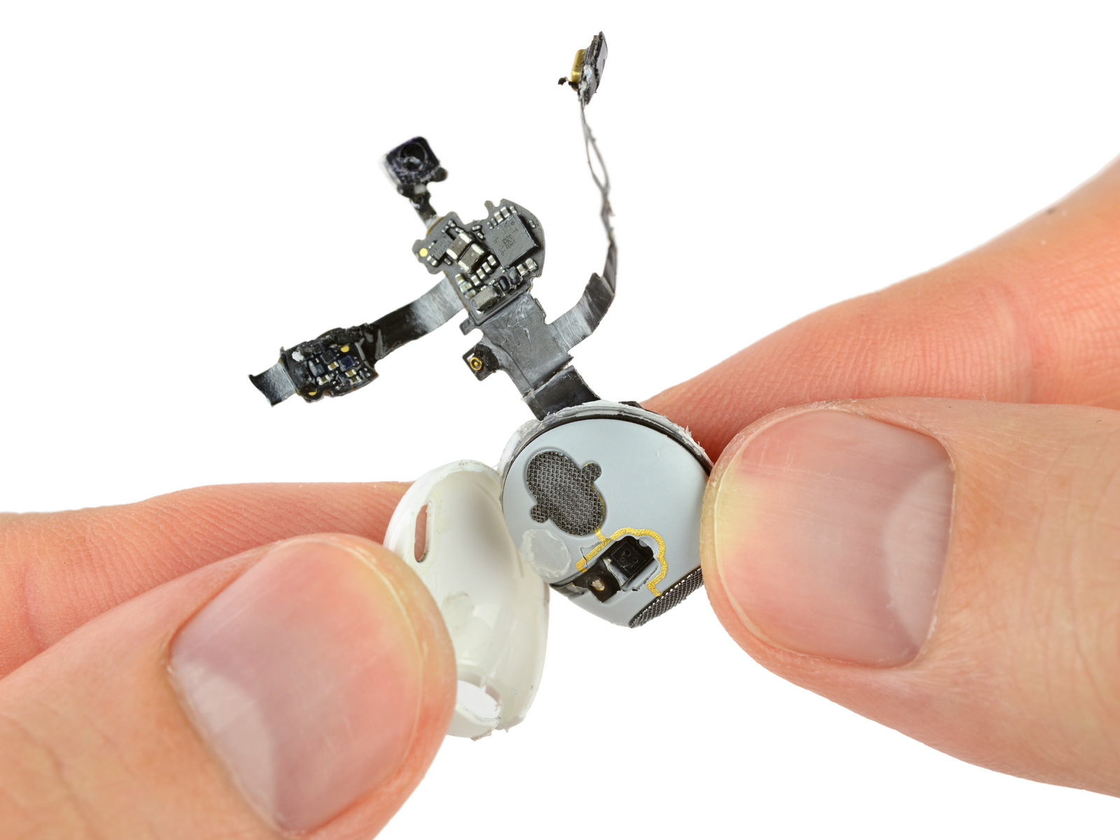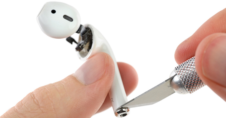 Ve sluchátkách je vše uložené velmi natěsno. Vzhledem k jejich velikosti se ovšem není příliš čemu divit. Sluchátka se dají rozdělit na dvě hlavní části, kterými jsou reproduktorová část a tělo. Během postupu se jasně ukázaly například dva infračervené senzory, které zde slouží jako proximity senzory pro ovládání a přerušení přehrávání při vyndání sluchátka z ucha. V celé konstrukci se nachází poměrně značné množství lepidla. Je to pravděpodobně právě toto lepidlo, které může za téměř dokonalou odolnost proti vodě, jak jsme se již několikrát přesvědčili. Pro přístup do těla krabičky se muselo její tělo roztrhnout. Následně se ukázala základní deska s baterií (1,52 Wh) a dalšími komponenty. Vzhledem k destruktivní povaze této rozborky skončily AirPods se skóre 0 bodů z 10.