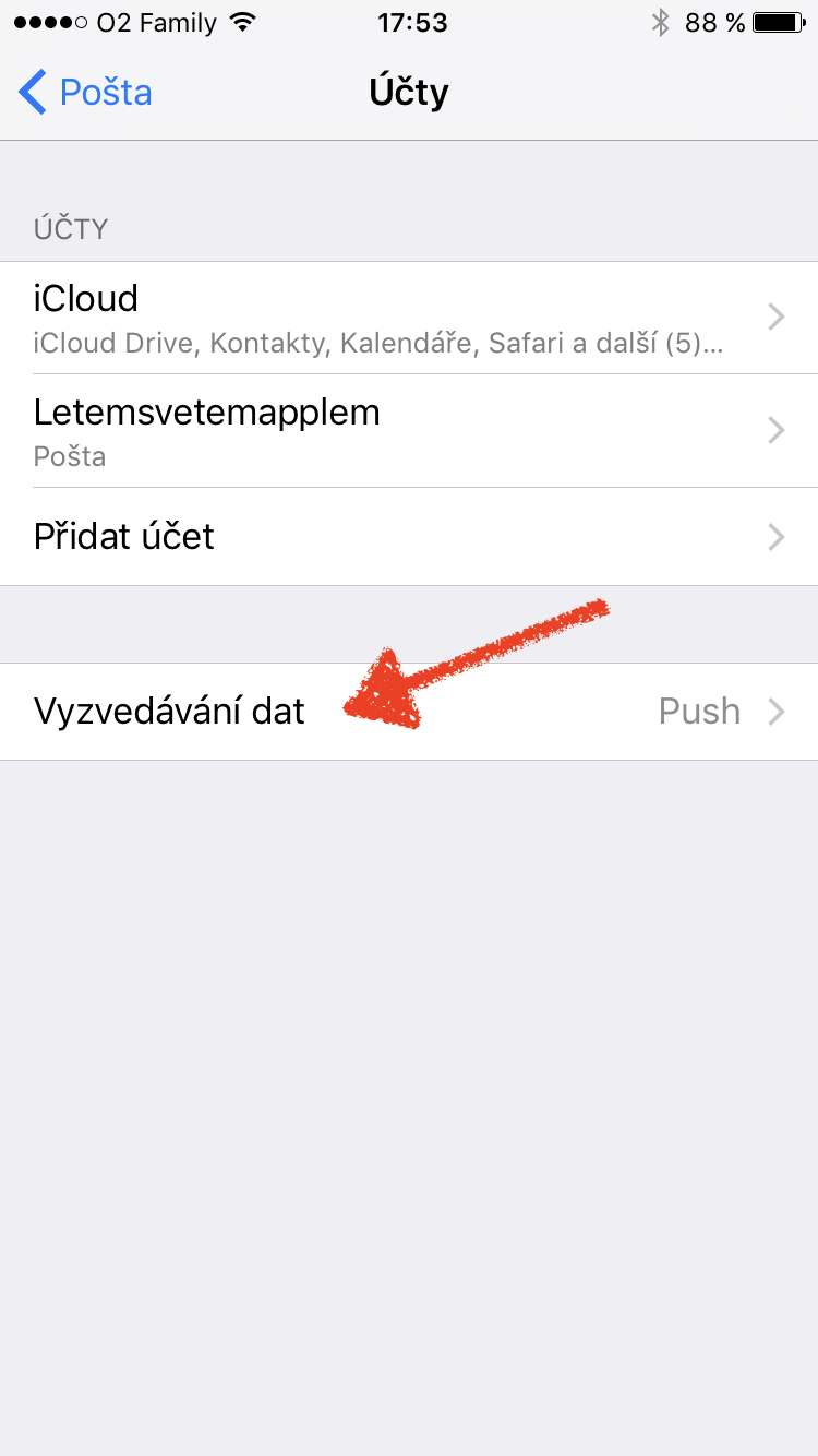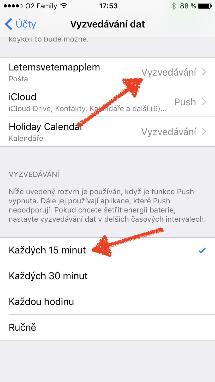 V první řadě je nutné otevřít Nastavení –> Pošta –> Účty –> Vyzvedávání dat a zde dole v sekci Vyzvedávání přepnout z Ručně například na Každých 15 minut. Nahoře si pak u svého e-mailového účtu zkontrolujte, že máte nastavenou volbu Vyzvedávání. Pokud ne, tak ji na Vyzvedávání přepněte. U iCloudu nechte volbu Push.