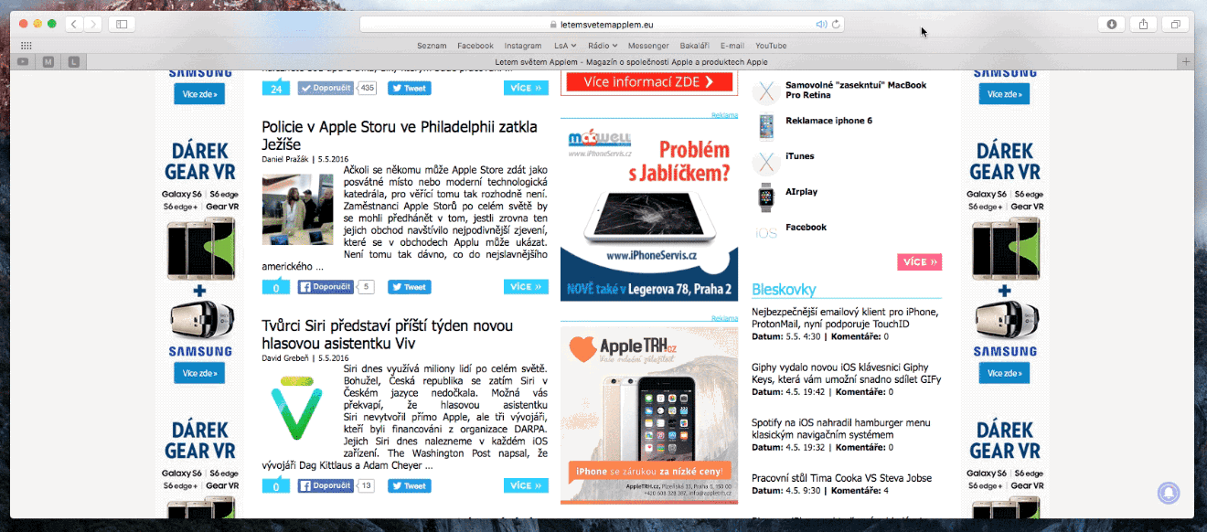 Pokud začínáte svůj den na Macu s několika oblíbenými stránkami, pak je v Safari možnost, jak je otevřít všechny najednou. Stačí si je všechny stránky přidat do jedné složky, tu si umístit do panelu oblíbený stránek, kterou si zapnete podle návodu v bodě 2 a poté podržet klávesu Alt (⌥) a kliknout myší na složku. Otevřou se všechny panely ze složky a nahradí vám ty otevřené. Pokud nechcete, aby nahradily otevřené stránky, tak namísto klávesy Alt podržte klávesu Cmd (⌘). Poslední možností ještě je kliknout na složku pravým tlačítkem myší a zaškrtnou volbu Automaticky nahrazovat panely. U složky se poté ukáže ikona čtverce a pak už jen stačí na složku kliknou myší a otevřou se všechny stránky v ní umístěné. Problém poslední metody je v tom, že nelze otevřít jen jednu stránku ze složky.