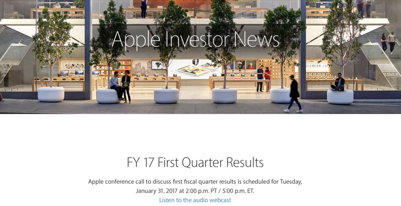 Apple aktualizoval svou stránku pro investory a oznámil tak, že zveřejní své finanční výsledky za Q1 2017 (čtvrté kalendářní čtvrtletí) v úterý 31. ledna. Bude se přitom jednat o jedny z nejočekávanějších výsledků od Applu za poslední dobu, protože jde o vánoční období, které je vždy nejvýdělečnější a zároveň jde o první čtvrtletí, kam se ve velkém promítnou prodeje iPhonu 7. Všechny tak zajímá, jestli nový telefon od Applu dokáže zvrátit trend posledního roku. Minulý rok dokázal iPhone 6s v Q1 2016 jen s malým náskokem porazit prodeje iPhonu 6 z předchozího roku. Zároveň se také dozvíme, jak se daří novým MacBookům Pro.