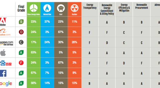 Společnosti získala 83% hodnocení na indexu čisté energie a po zásluze tak byla ohodnocena známkou A. V dílčích kategoriích (které si můžete prohlédnout na obrázku níže) si Apple vedl také velmi dobře. Stejnou známku jako Apple si odnesly také společnosti Facebook a Google, které se ekologií také velmi aktivně zabývají. Poměrně špatně dopadl například americký gigant Amazon, nebo čínský Alibaba. Zdaleka nejhůř ovšem dopadla další čínská společnost Baidu. Ta se očividně problematikou ekologie příliš nezabývá a jak se zdá, jediné negativum, které z toho plyne, je známka F na indexu od Greenpeace.