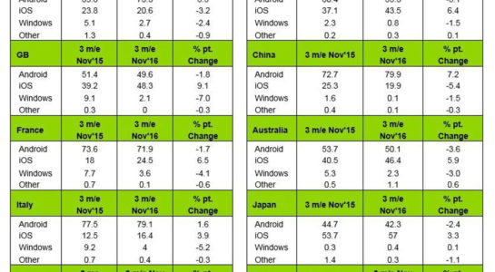 Toto pořadí je stejně na všech trzích, které Kantar monitoruje. Jak si jednotlivé platformy stojí, si můžete prohlédnout v tabulce níže. Android je na tom nejlépe ve Španělsku, kde zabírá impozantních 86,5% trhu. Apple si naopak nejlépe vedl v Japonsku, kde získal velmi slušných 57%. Skomírající Windows 10 je na tom všude špatně, nejlíp si vede v Itálii, kde mu patří 4% trhu.