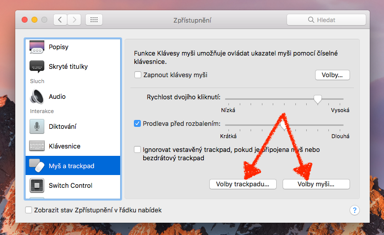- Klikněte na Volby Trackpadu… ve spodní části okna. Pokud chcete funkci vypnout i pro Magic Mouse, klikněte na Volby myši…, které se nachází hned vedle.